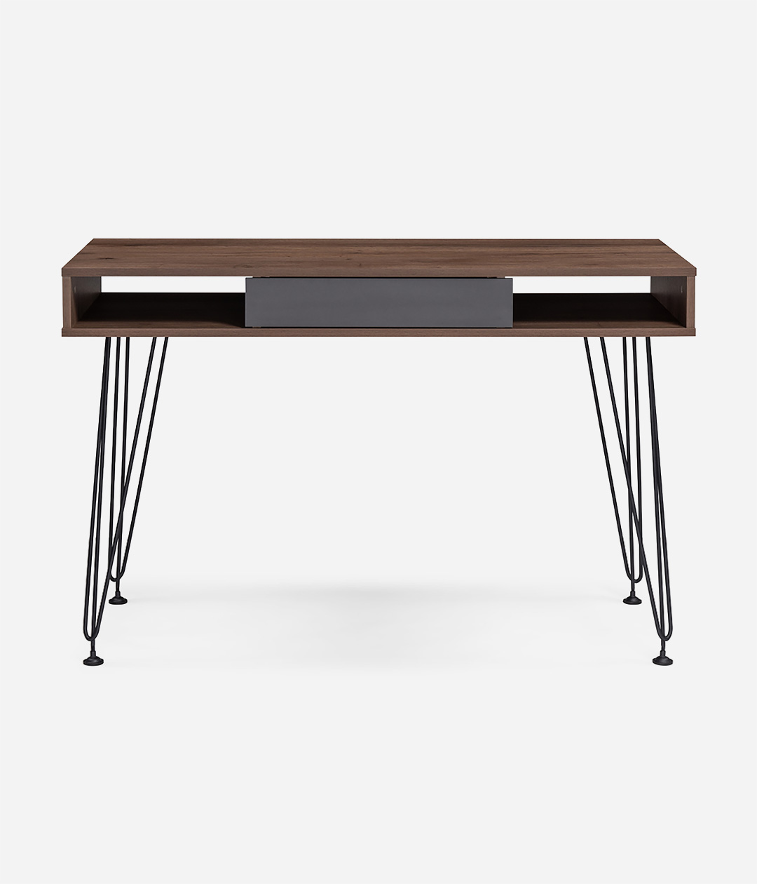 Письменный стол «Хиргра» с нишей и ящиком — лаконичная модель в стиле лофт подойдет для создания рабочего места в домашней обстановке. На широкой столешнице глубиной 60 см поместится компьютер с монитором, а так же хватит места для учебников и тетрадей. Модель оснащена широким ящиком и нишей под столешницей, где можно хранить множество различных вещей.