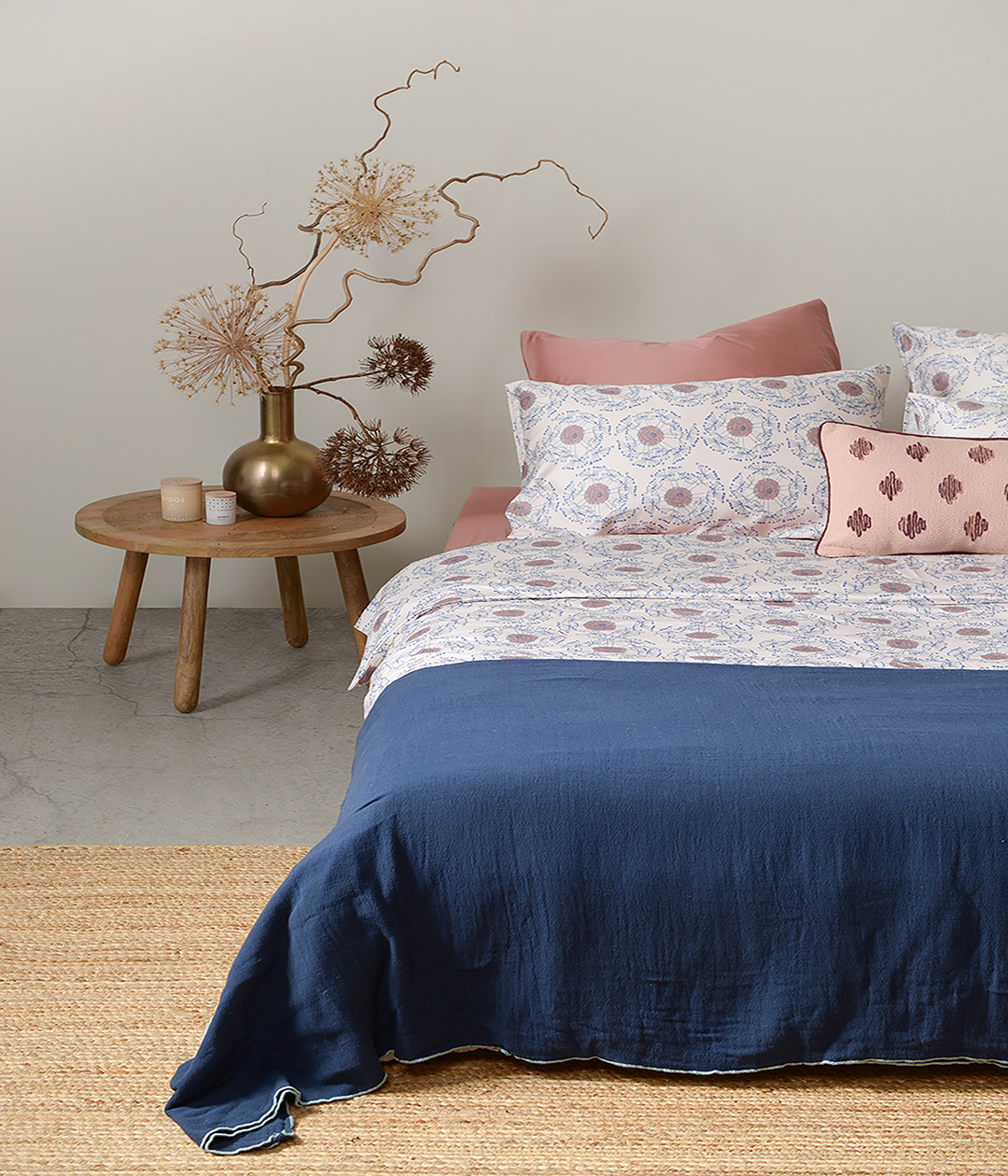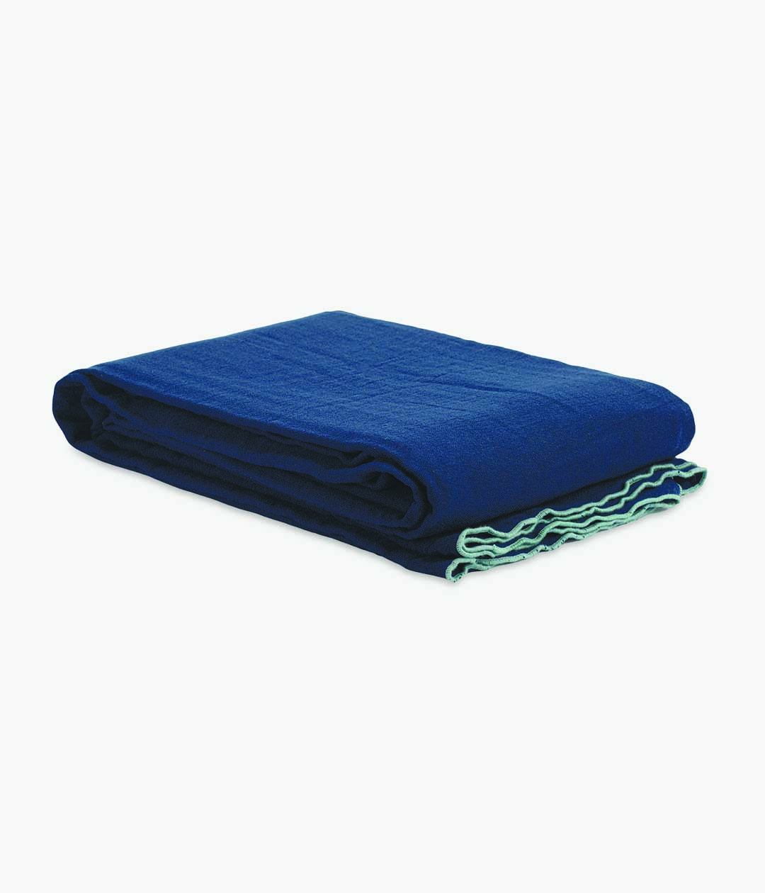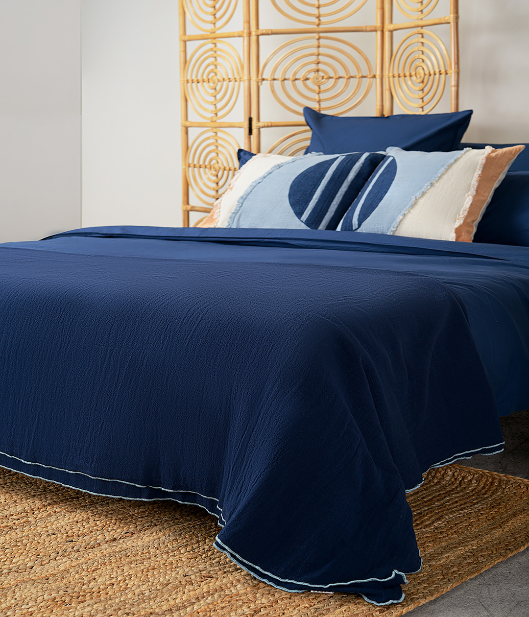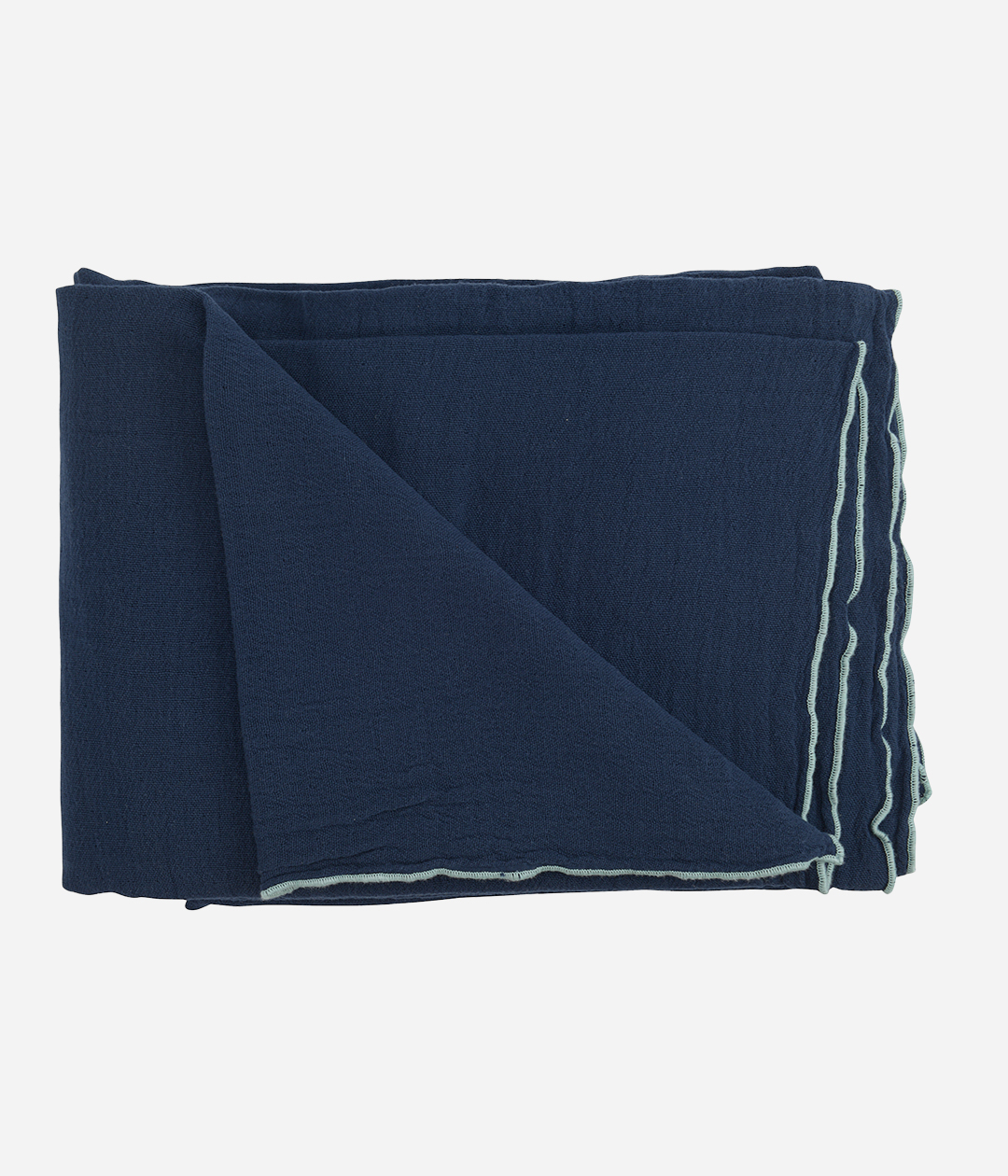 Покрывало легкое из хлопка темно-синего цвета с контрастным голубым кантом из коллекции Essential подойдет для любого интерьера. Однотонная модель будет сочетаться с любым постельным бельем, пледом и декоративными подушками.