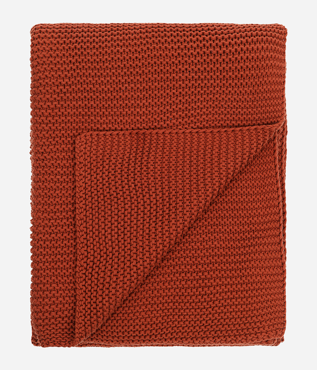 Плед терракотового цвета из хлопка жемчужной вязки из коллекции Essential – стильный аксессуар для спальни, гостиной или детской комнаты.