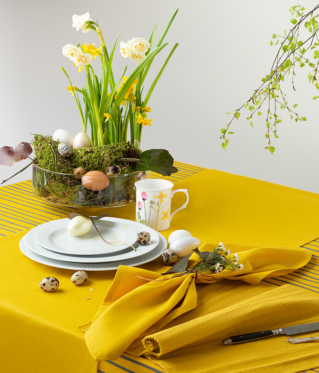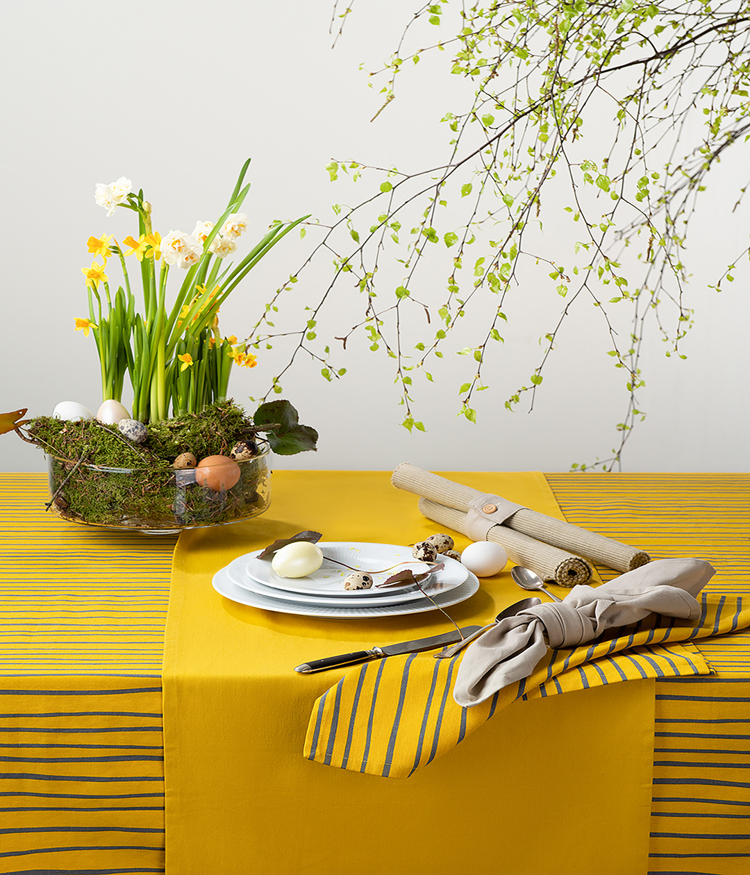 Дорожка на стол из хлопка горчичного цвета из коллекции Prairie гармонично дополнит повседневную и праздничную сервировку и впишется в любой современный интерьер.