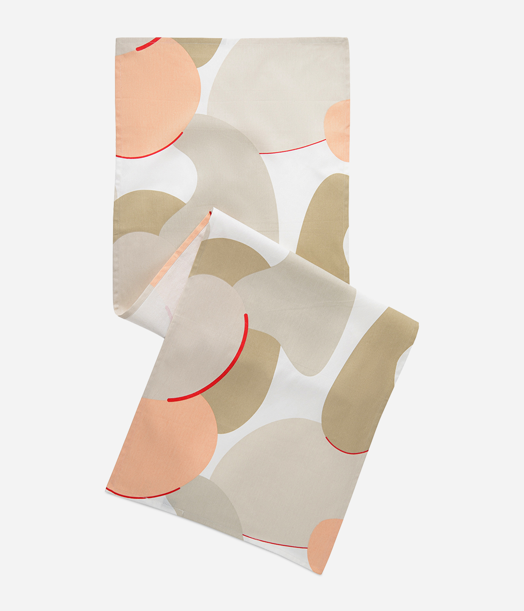 Дорожка на стол из хлопка бежевого цвета с авторским принтом из коллекции Freak Fruit гармонично дополнит повседневную и праздничную сервировку и впишется в любой современный интерьер. Абстрактный принт не имеет повторяющегося раппорта и представляет собой единую законченную картину.