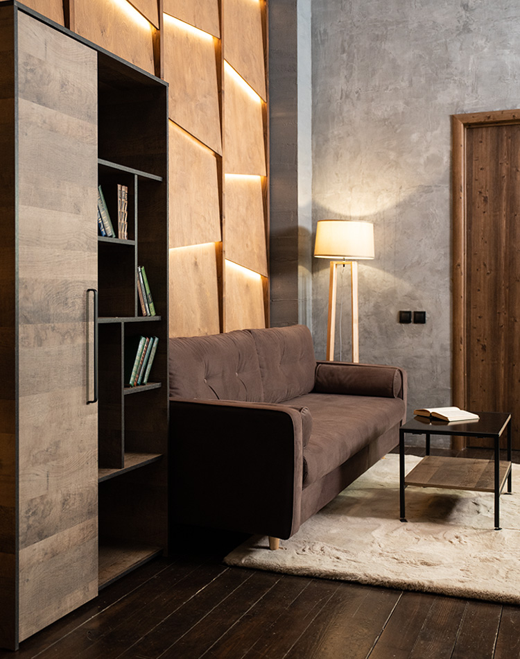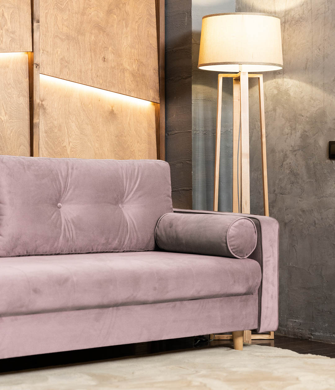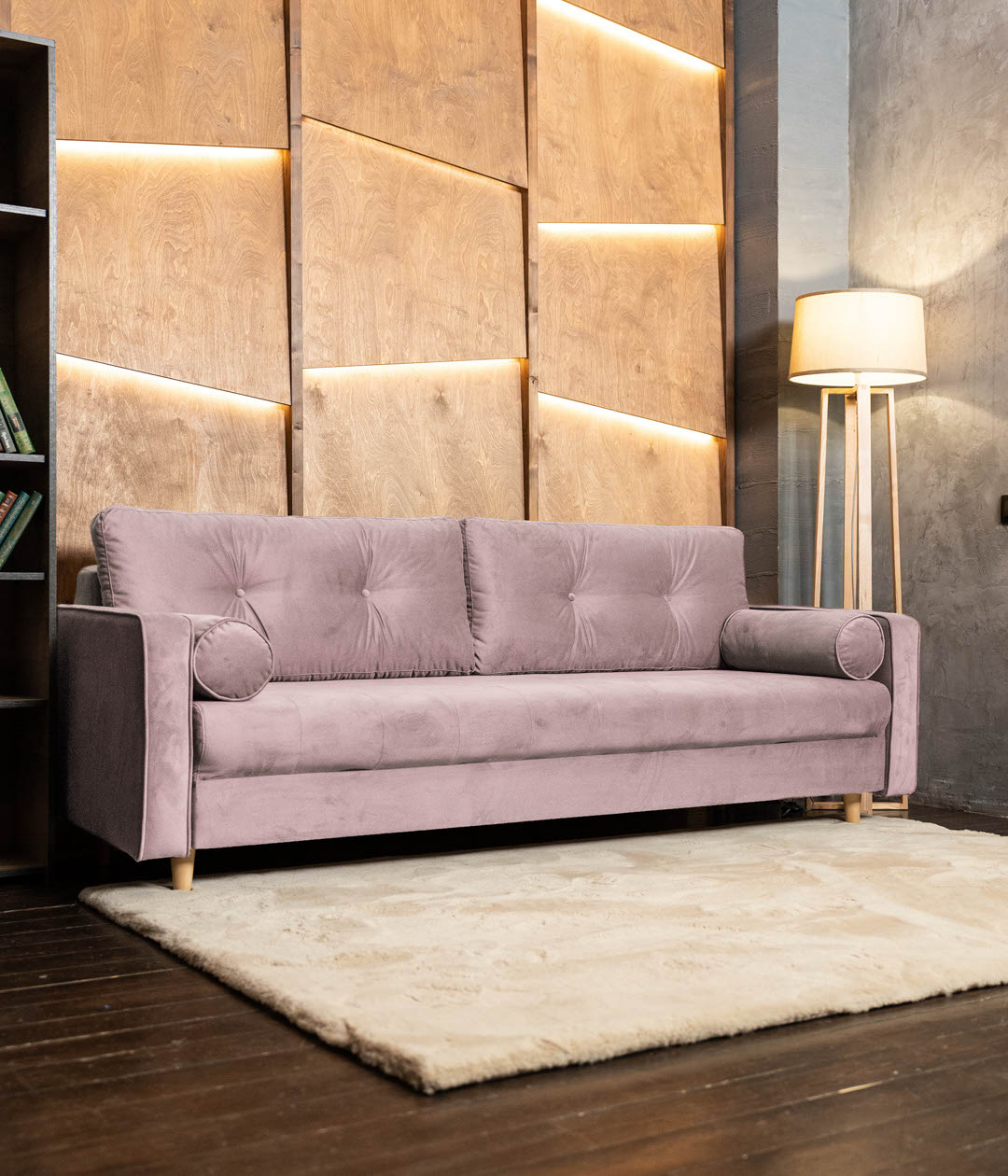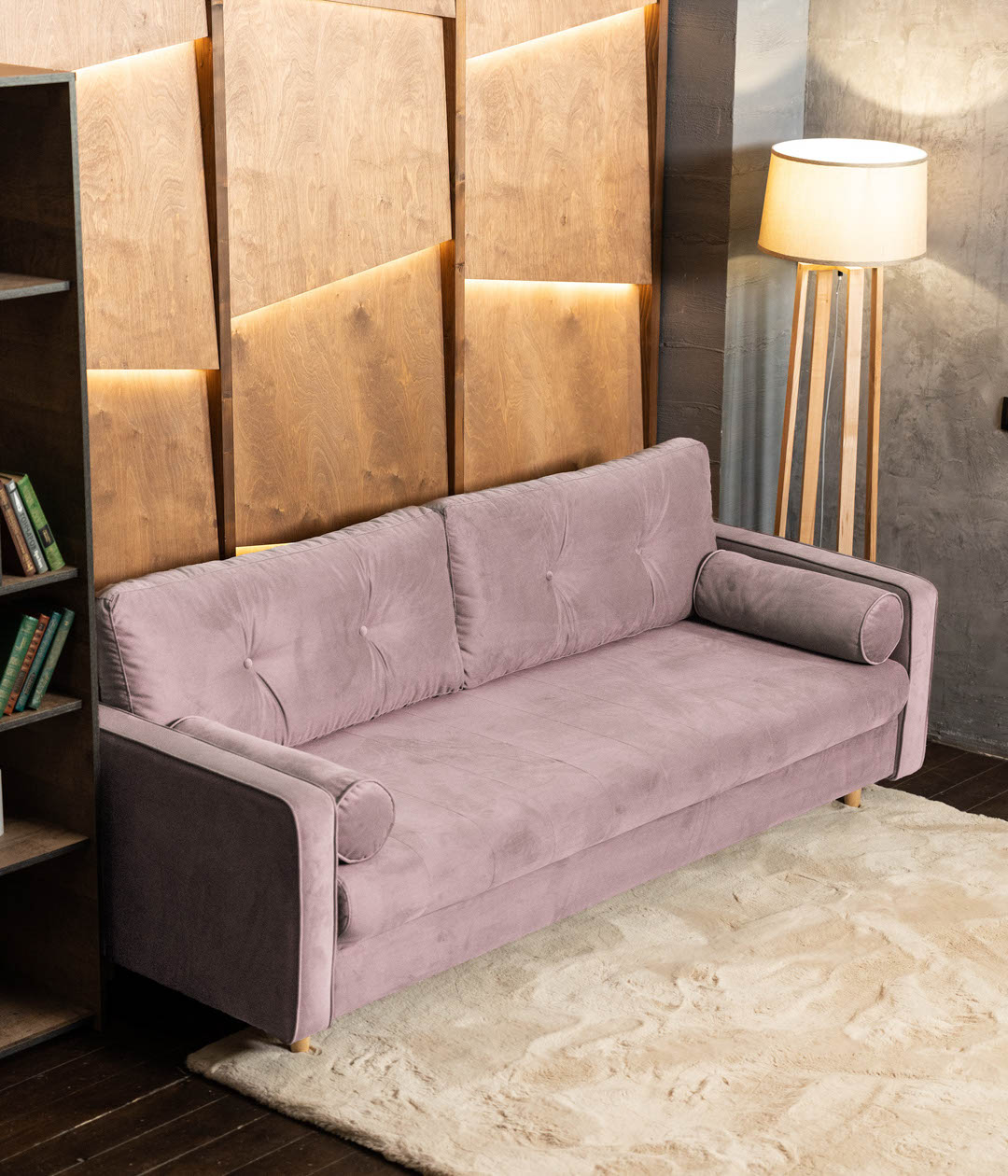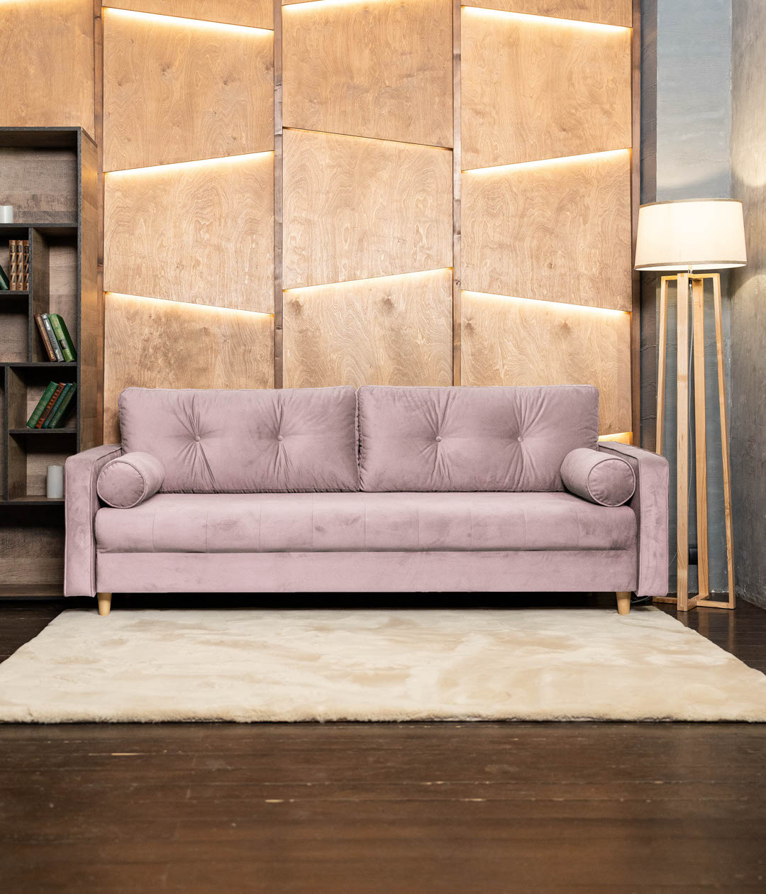 Высокие ножки дивана делают его форму легкой, максимально открывая пространство. А натуральное дерево подчеркивает естественность материалов. Кроме того, такая конструкция упрощает уборку, делая доступным напольное покрытие.