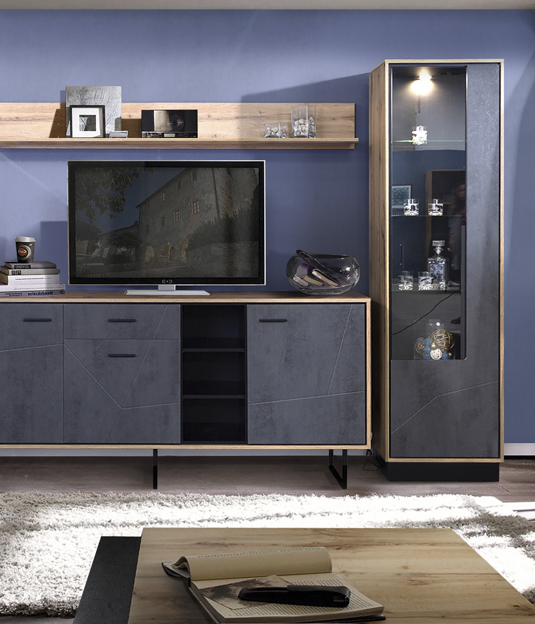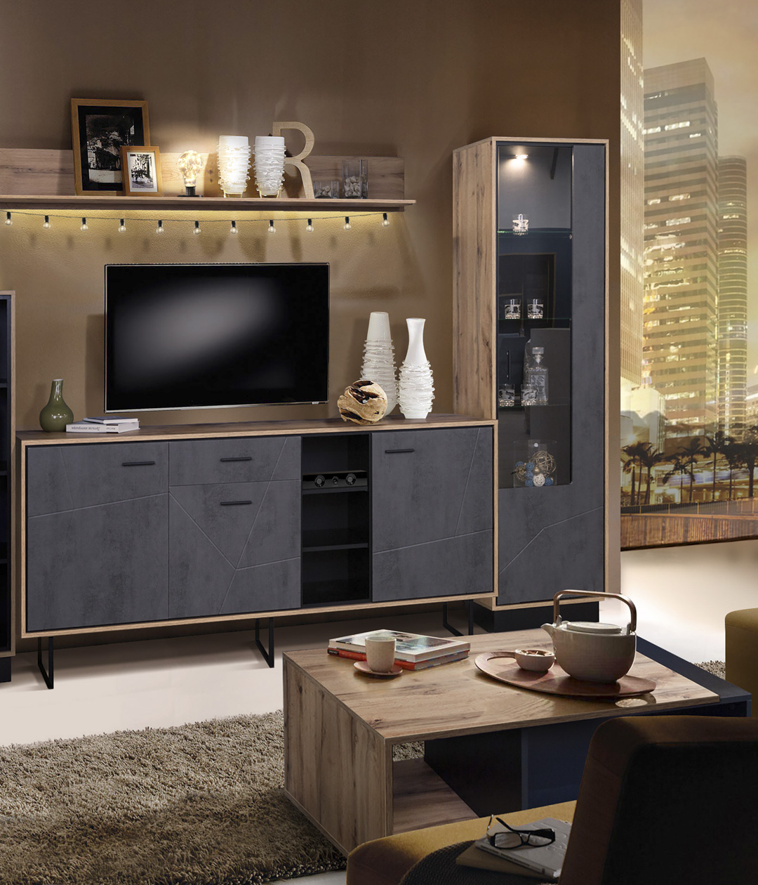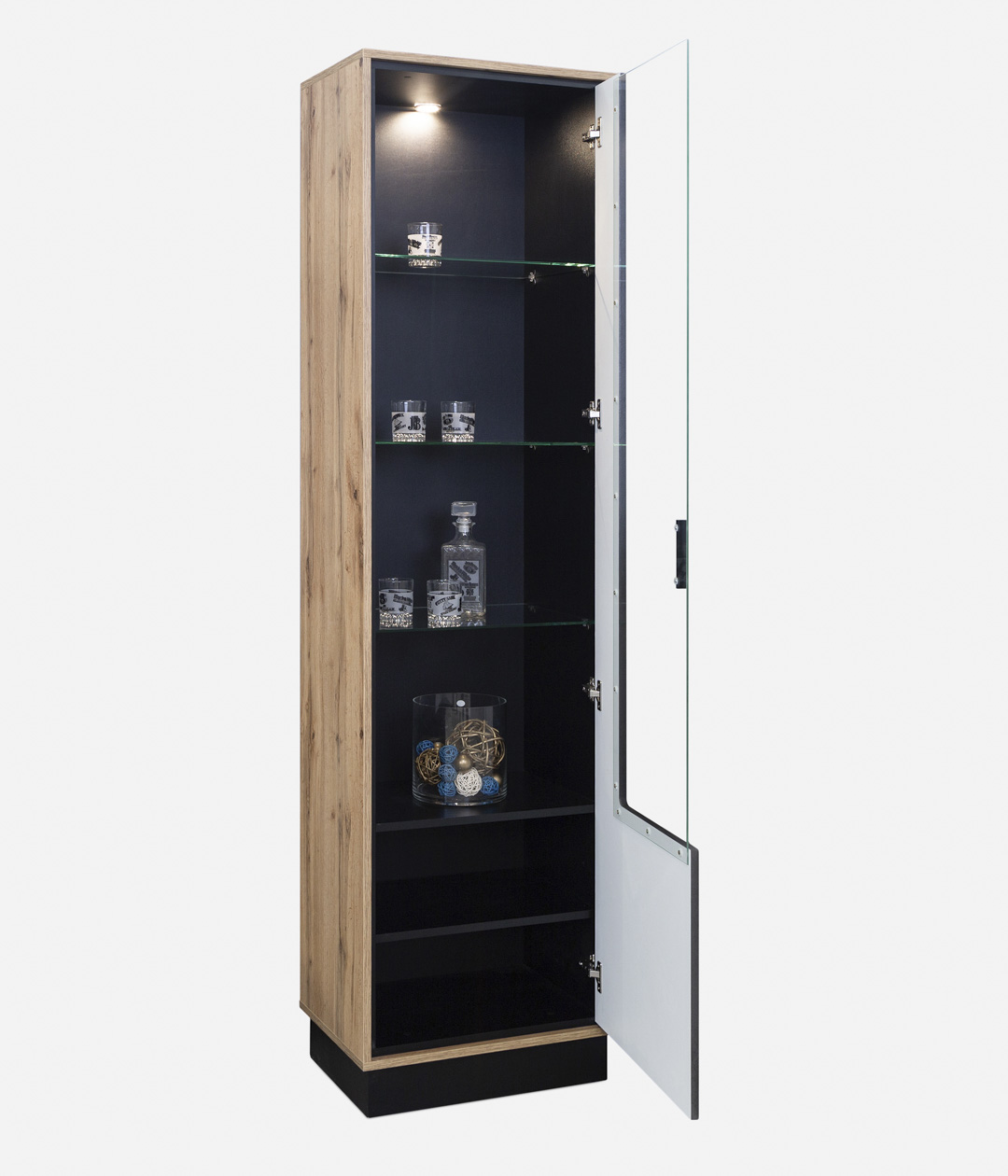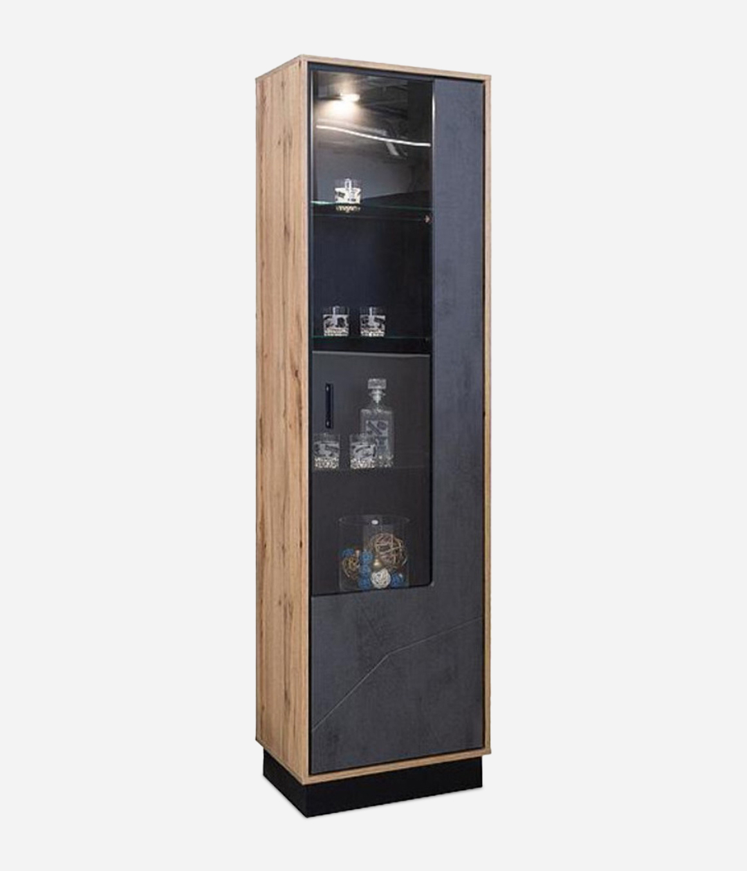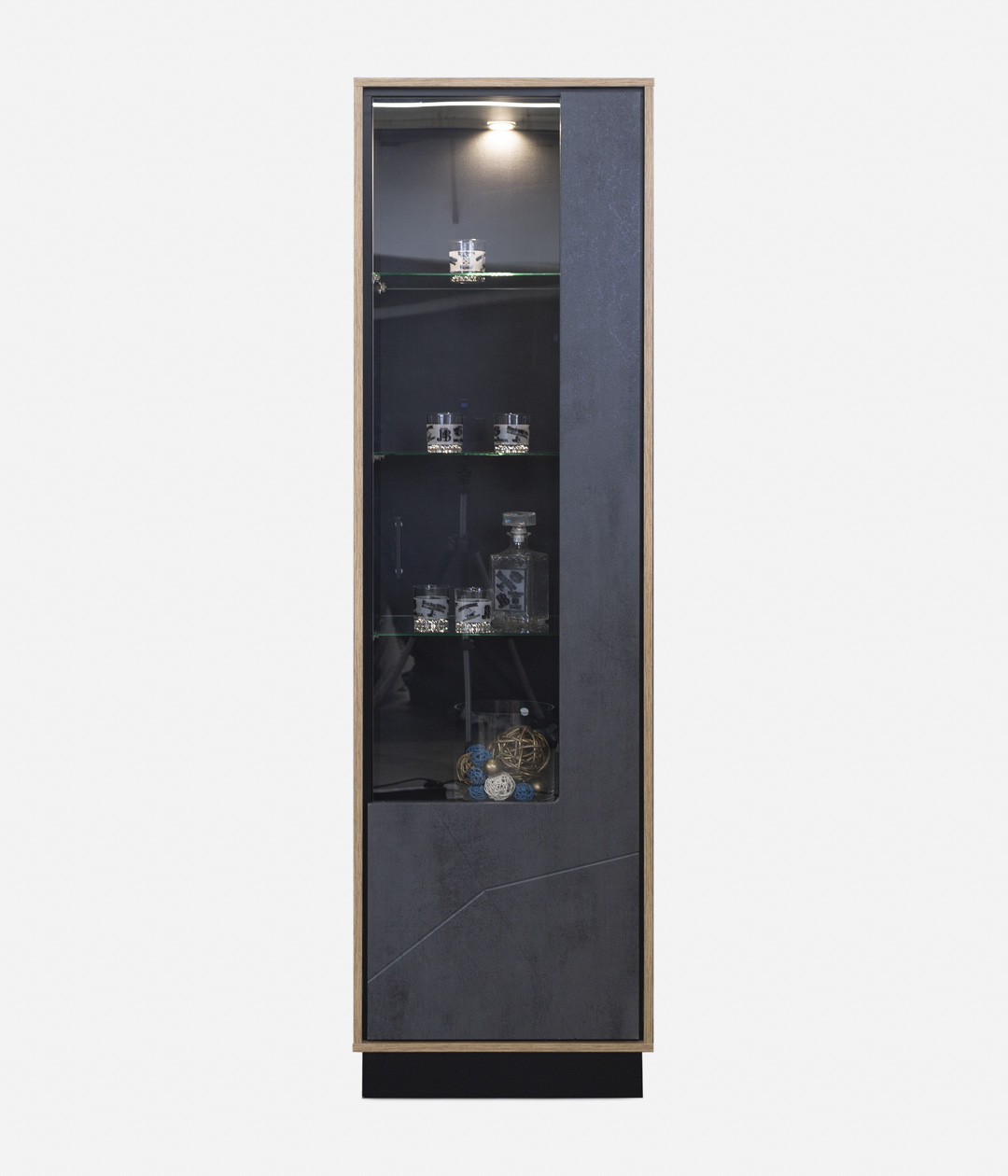 Шкаф-витрина Лайн с четырьмя витринными и двумя закрытыми полками украсит интерьер гостиной в стилях лофт. Тёмная цветовая палитра и современная функциональность с возможностью расширения добавят в жилое помещение уют и комфорт.