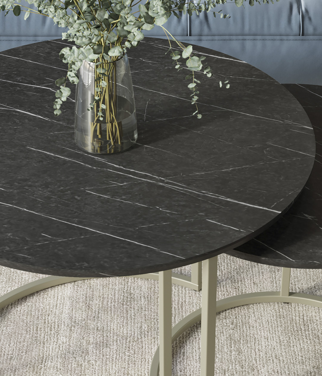 Комплект журнальных столиков выполнен в стиле лофт, сочетающем оригинальную текстуру декоративного покрытия столешницы и металлического подстолья в цвете черный или титан. Благодаря своей строгой элегантности и универсальности журнальные столики легко комбинируются с мебелью в современном стиле.