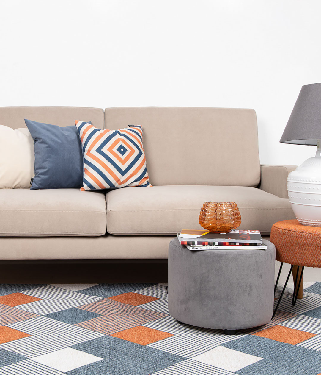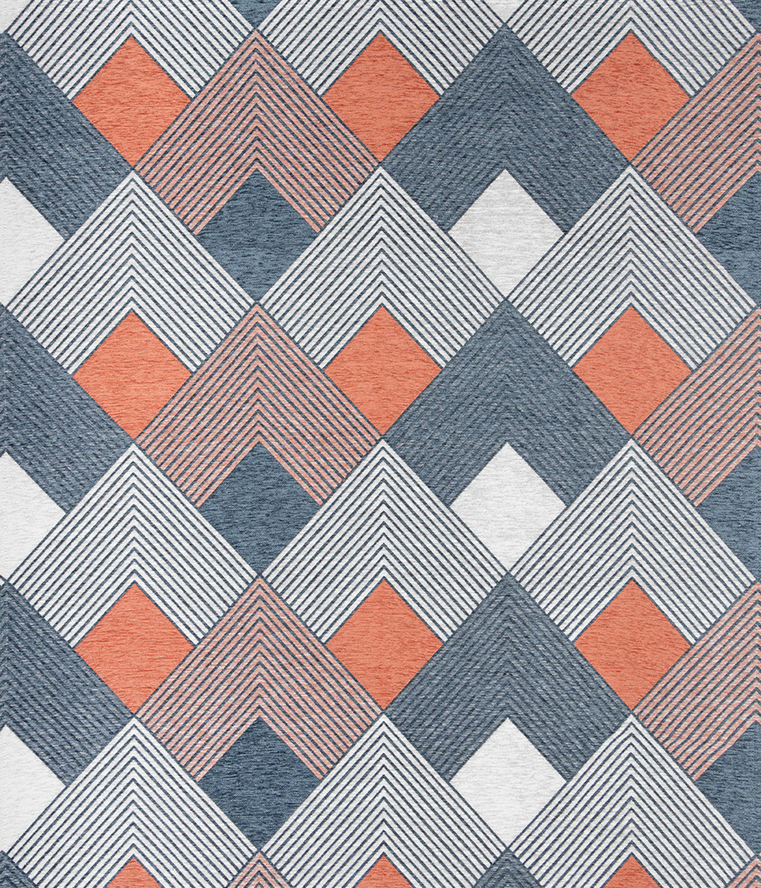 Необычное контрастное цветосочетание выделяет ковер LINE FROST среди остальных. Комбинация модного джинсового и пыльно-оранжевого оттенков органично впишется в современный интерьер в спокойной цветовой гамме. Шенилловый ковер из натуральных материалов станет великолепным акцентом, дополняющим общую композицию.