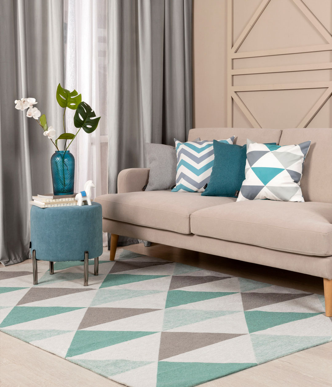 Ковер LINE NILS. Скандинавские мотивы нашли отражение в лаконичном дизайне ковра - четкий геометрический рисунок и практичная шенилловая основа. Все это соответствует основным принципам популярного стиля - минимализм и функциональность. Микс нежно-ментоловых и серо-графитовых треугольников на светлой основе делает рисунок ковра объемным.