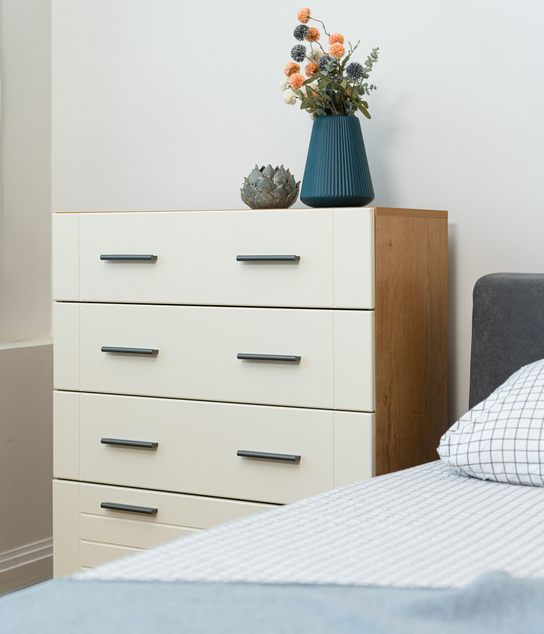 Благодаря четырем вместительным ящикам, комод позволяет удобно разместить все необходимые вещи - будь то одежда, постельное белье или аксессуары.