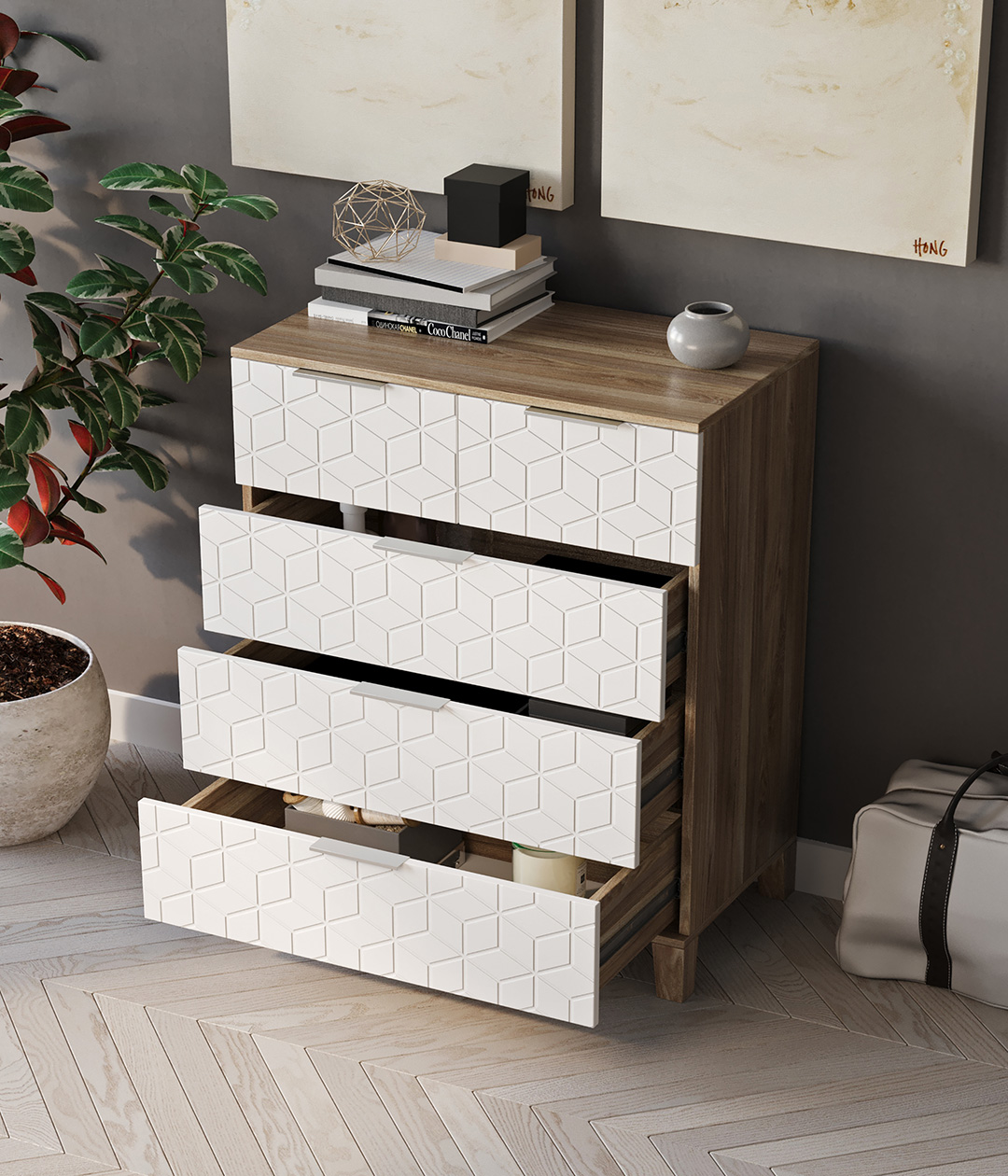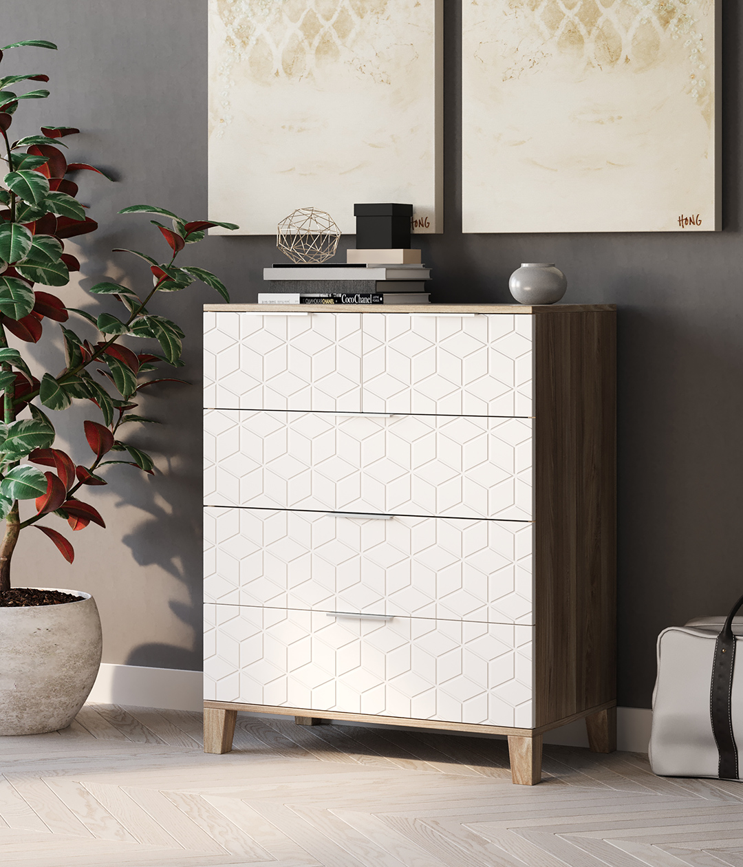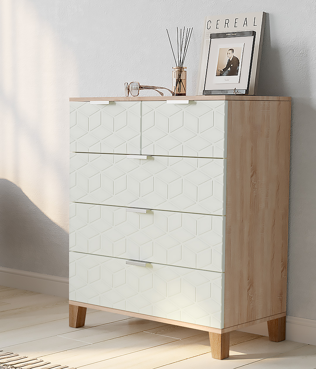 Стильный и практичный комод, решит как минимум две ваших задачи, будет служить многофункциональной нишей для хранения вещей, одежды, белья и универсальной подставкой для различных предметов интерьера, а также можно использовать в виде тумбы под телевизор.