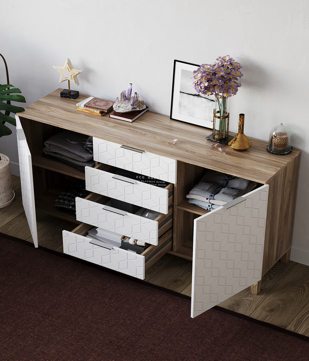 Стильный и практичный комод, решит как минимум две ваших задачи, будет служить многофункциональной нишей для хранения вещей, одежды, белья и универсальной подставкой для различных предметов интерьера, а также можно использовать в виде тумбы под телевизор.