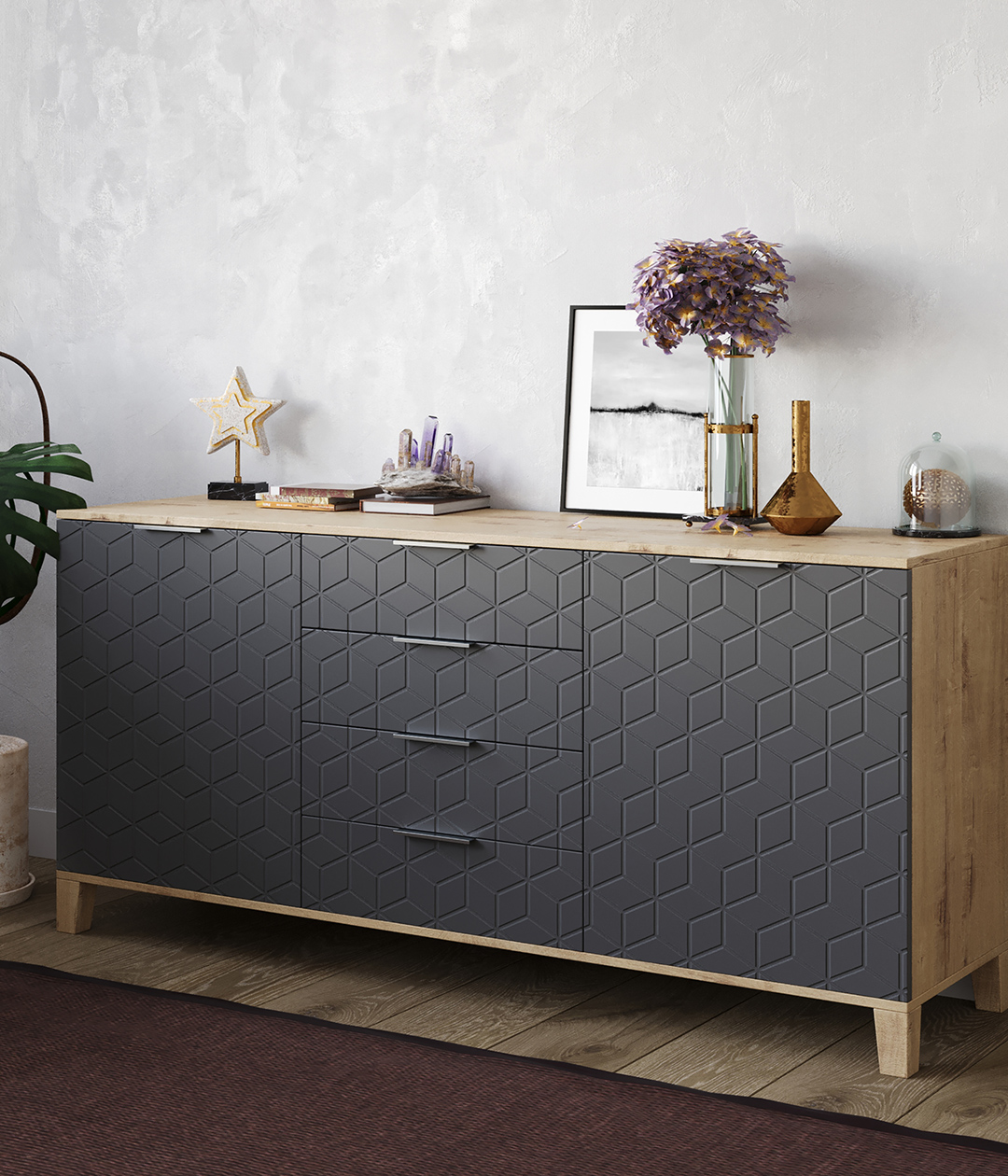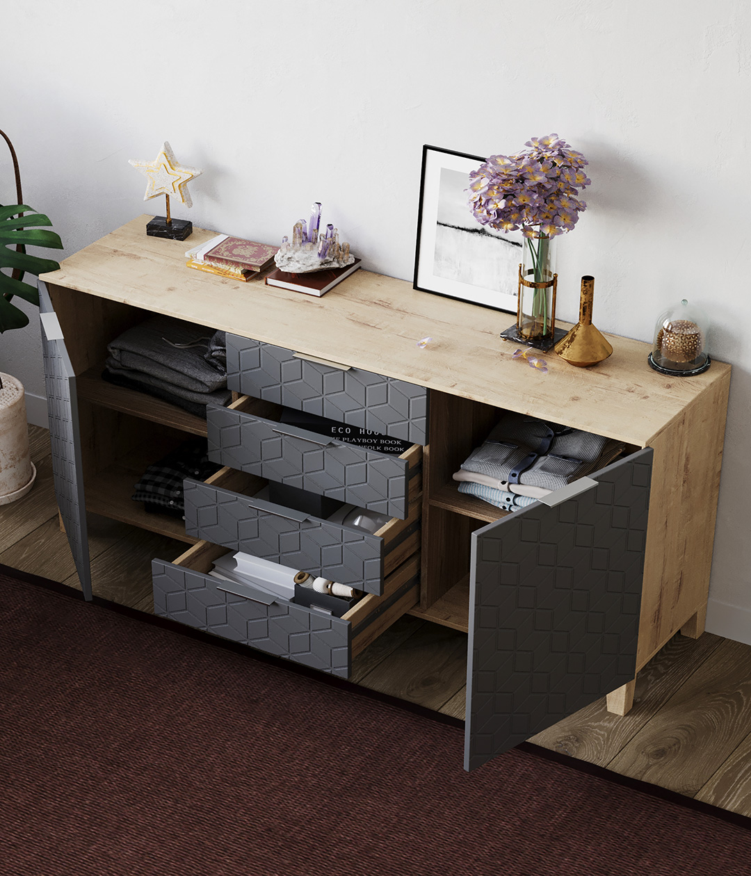 Стильный и практичный комод, решит как минимум две ваших задачи, будет служить многофункциональной нишей для хранения вещей, одежды, белья и универсальной подставкой для различных предметов интерьера, а также можно использовать в виде тумбы под телевизор.