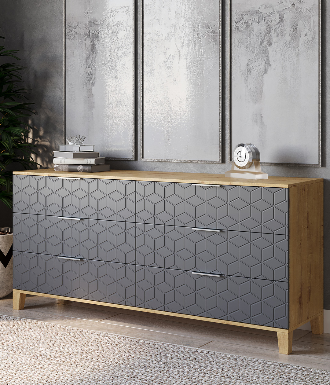 Стильный и практичный комод, решит как минимум две ваших задачи, будет служить многофункциональной нишей для хранения вещей, одежды, белья и универсальной подставкой для различных предметов интерьера, а также можно использовать в виде тумбы под телевизор.