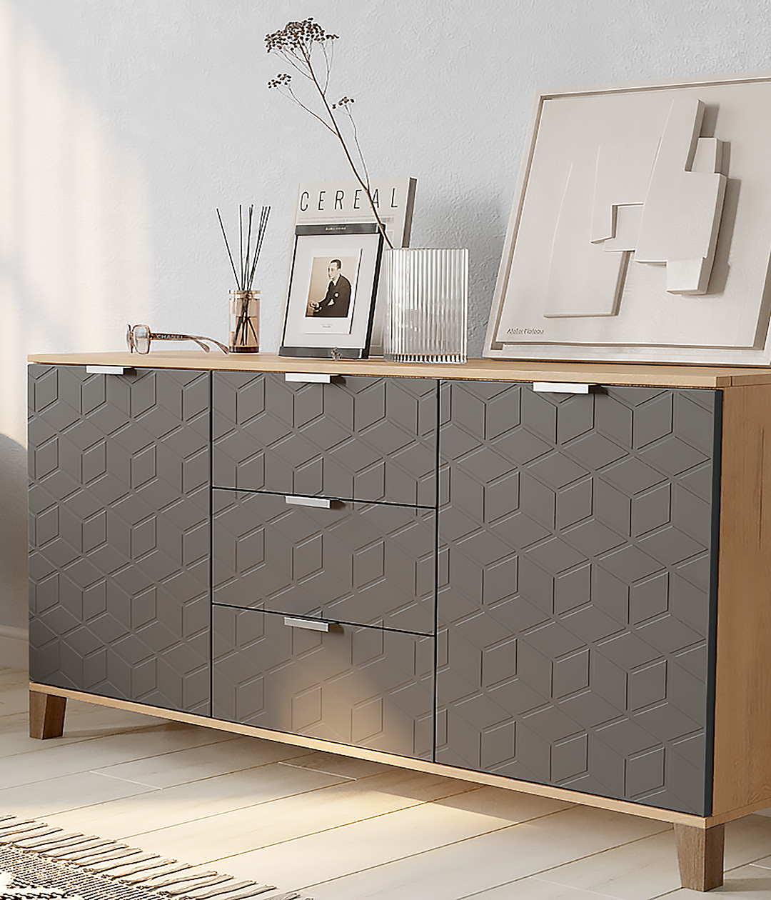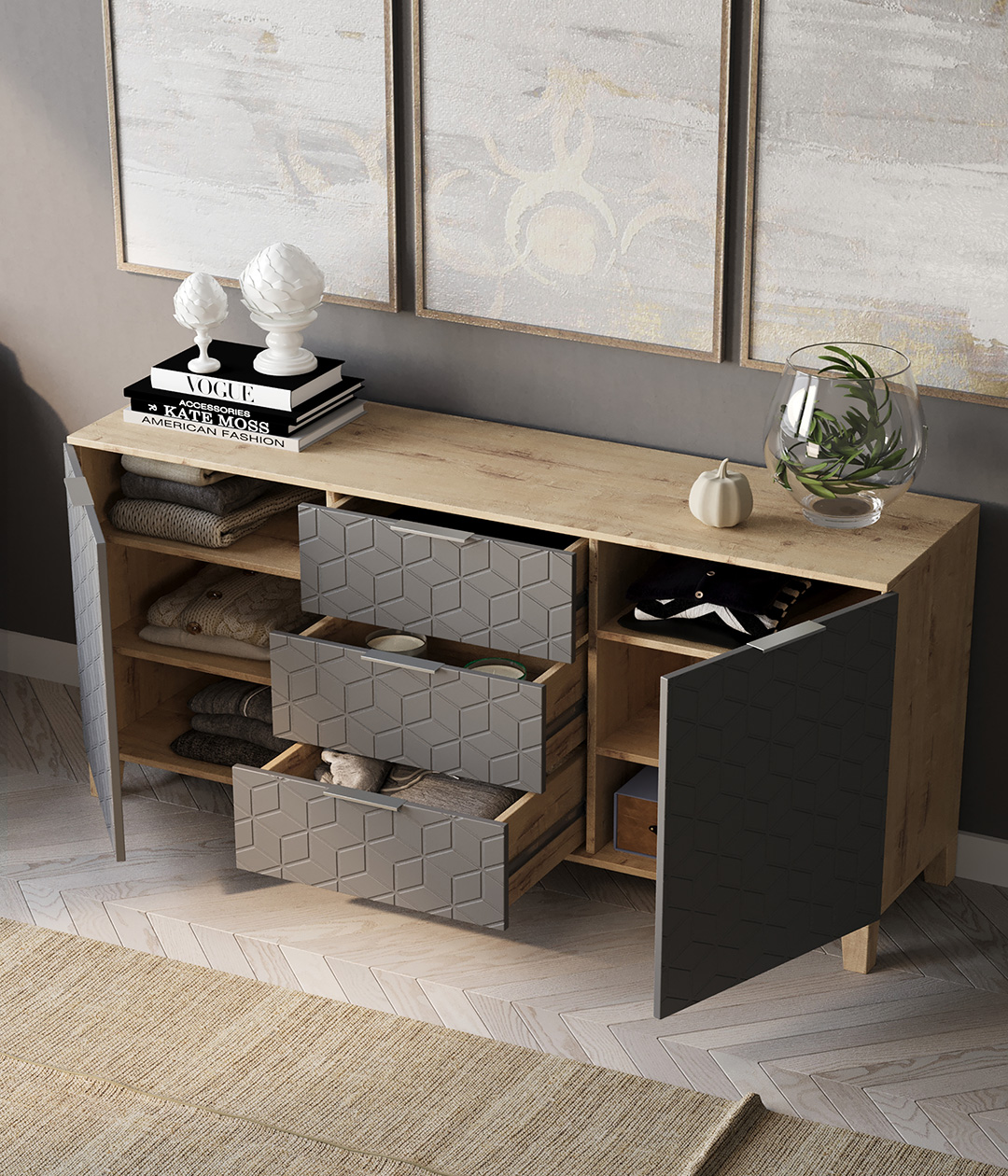 Стильная и практичная тумба, решит как минимум две ваших задачи, будет служить многофункциональной нишей для хранения вещей, одежды, белья и универсальной подставкой для различных предметов интерьера, а также можно использовать в виде тумбы под телевизор.