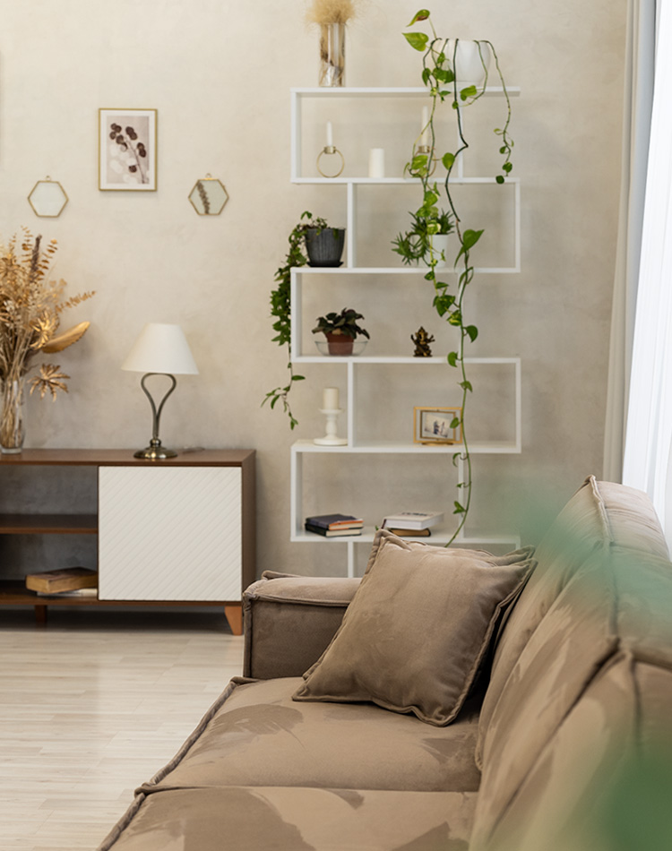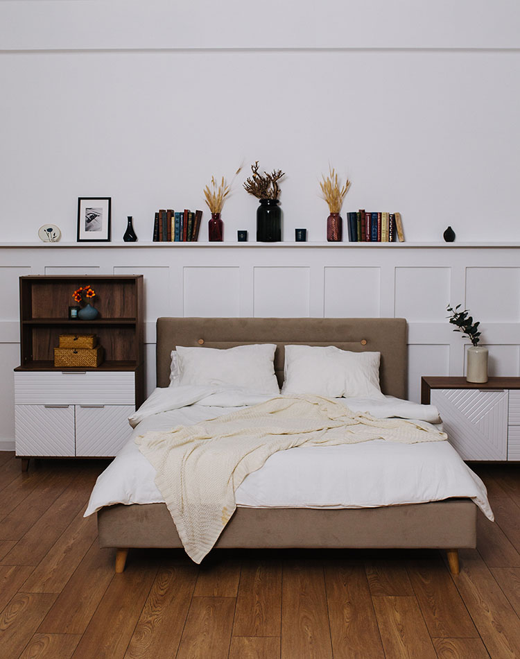 Высокие ножки делают его форму легкой, максимально открывая пространство. А натуральное дерево подчеркивает естественность материалов. Кроме того, такая конструкция упрощает уборку, делая доступным напольное покрытие.