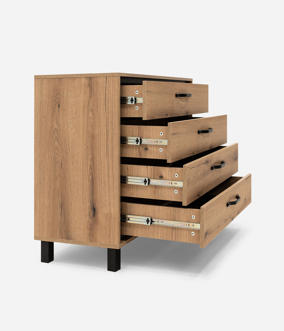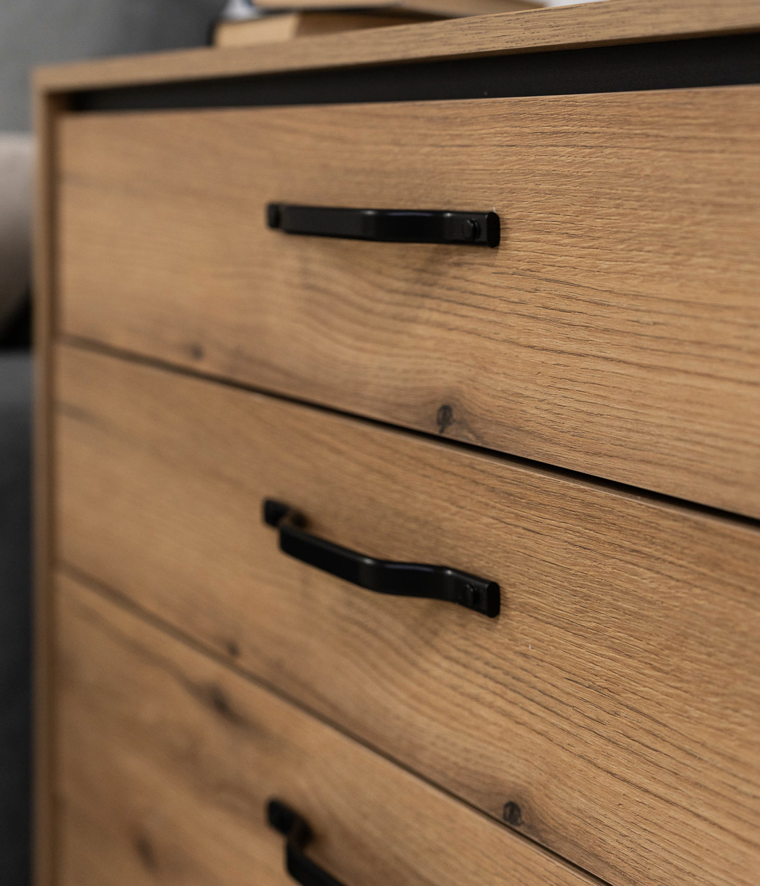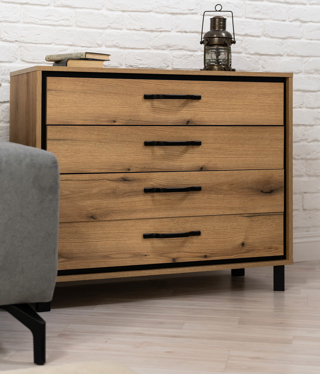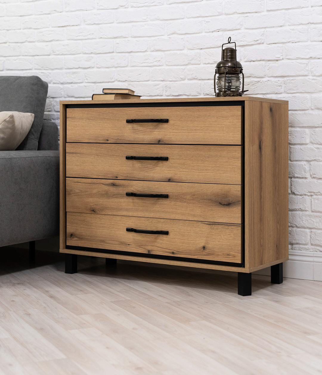 Комод «Мельбурн» с четырьмя вместительными ящиками в натуральных оттенках не перегрузит интерьер, добавит тепла и уюта в гостиную. Чёрные металлические ручки, пластиковые опоры и декоративные вставки по периметру фасадов позволяют получить красивую комбинацию, подчеркнуть текстуру, расставить акценты. Сочетание природного материала дуб Эвок прибрежный с тонкими чёрными элементами декора делают обстановку помещения одновременно строгой и лаконичной, при этом стильной и уютной.
