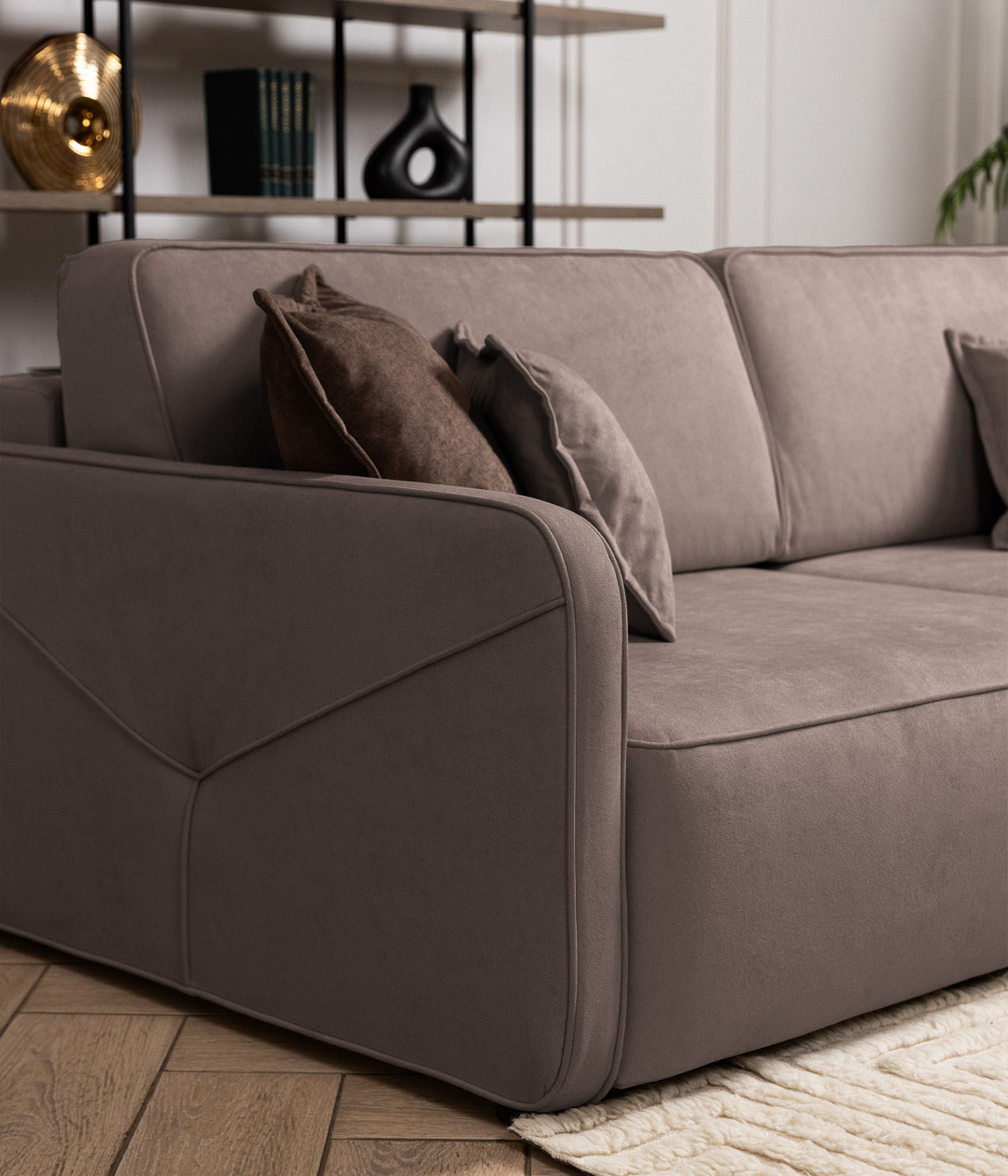 Диван Олеан с узкими подлокотниками, украшенными оригинальным декором, сочетает в себе стильный дизайн и практичность. Глубокая посадка обеспечивает максимальный комфорт, а простая система раскладывания позволяет легко превратить его в большое спальное место. Этот диван станет не только уютным местом для отдыха, но и стильным элементом интерьера, подходящим для повседневного использования.