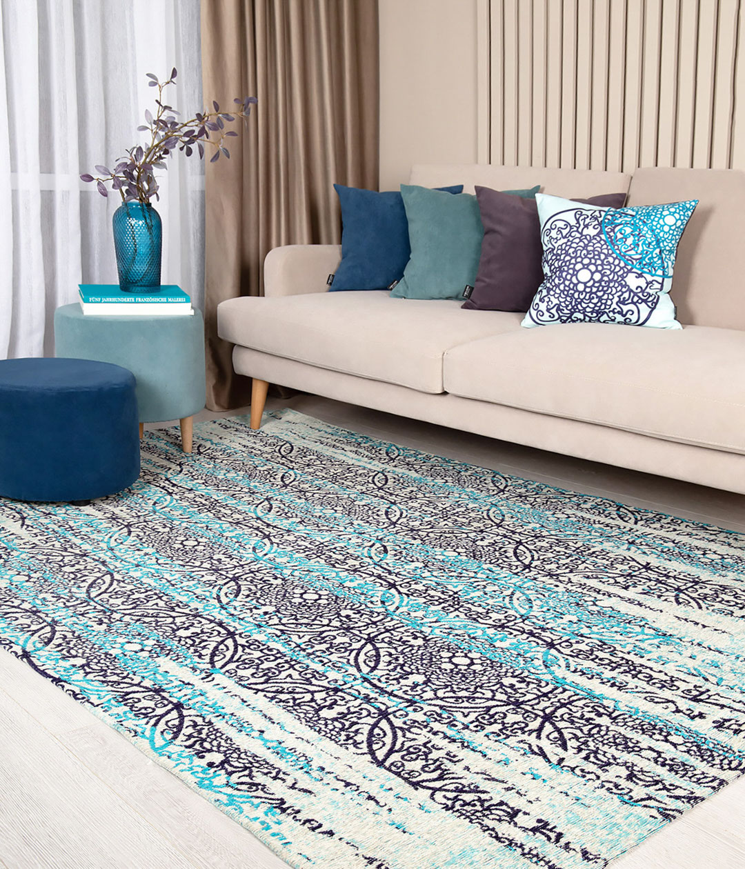 OLVI DESIRE- это оригинальный авторский ковер. Абстракция с элементами этники в виде «ловцов снов» придется по вкусу любителям необычных и броских дизайнов. Изюминку ковру добавляет и неординарное сочетание оттенков. Прекрасная комбинация цвета морской волны с фиолетово-джинсовым бесспорно притягивает к себе взгляд.
