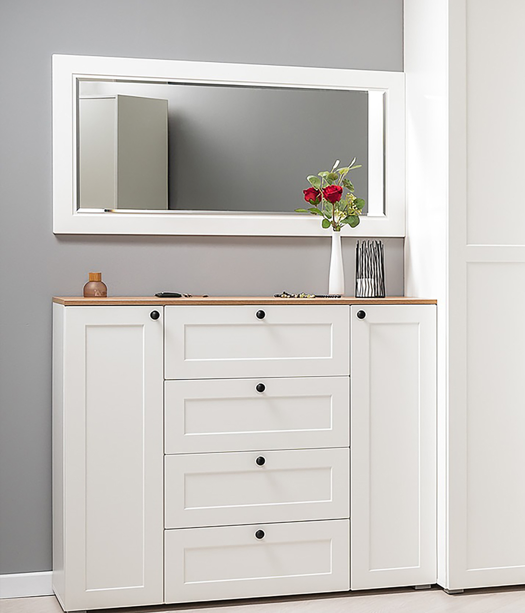 Комод Остин — стильное и практичное решение для оформления интерьера и организации пространства. Комбинированное наполнение предусматривает четыре выдвижных ящика по центру и два отделения с полками за распашными дверцами. Ящики оснащены направляющими скрытого монтажа, что обеспечит выдвижение на всю глубину, плавный бесшумный ход и длительный срок эксплуатации. Опоры регулируются по высоте, что позволит разместить комод на полу с неровностями.