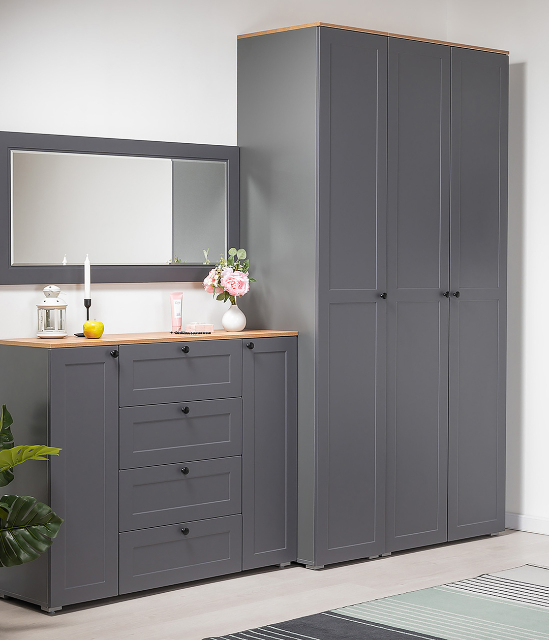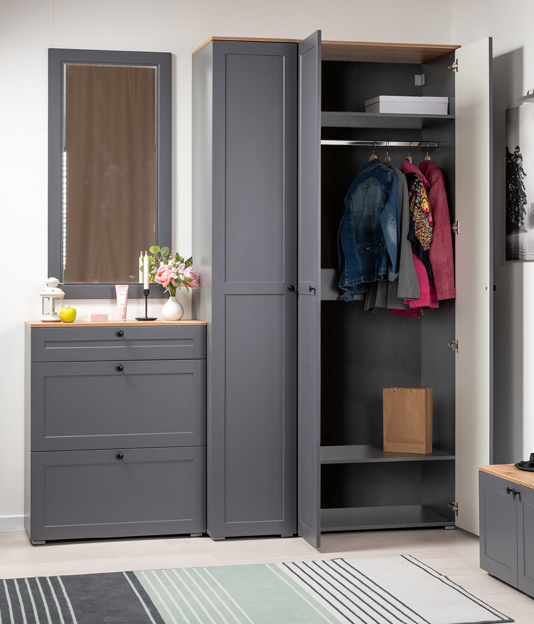 Распашной шкаф Остин поможет организовать пространство для хранения гардероба. Внутреннее наполнение представлено продольной штангой для вешалок и полками для обуви и головных уборов. Опоры регулируются по высоте, что позволит разместить модель на полу с неровностями.