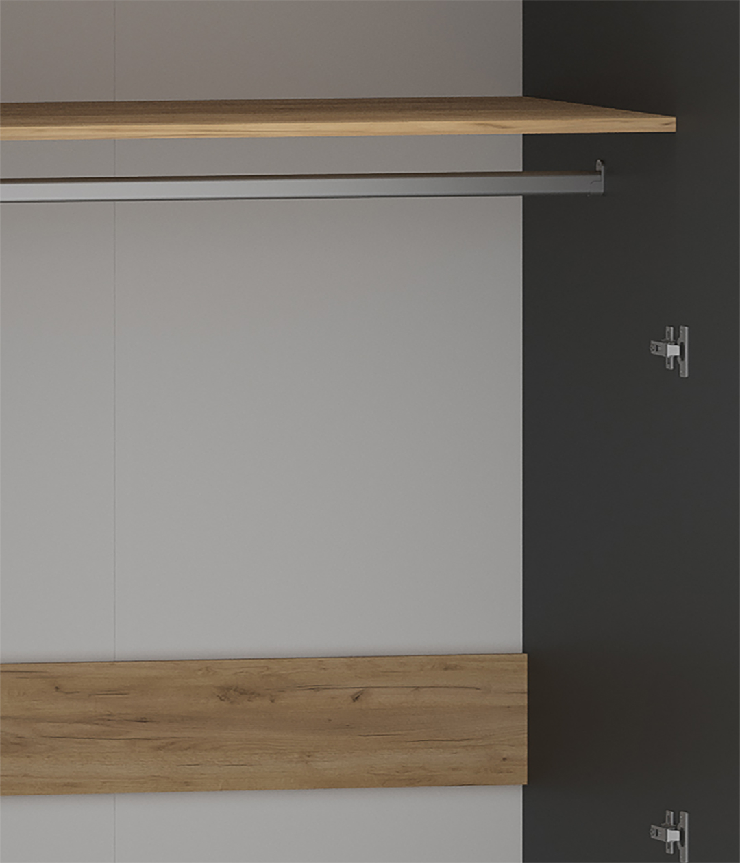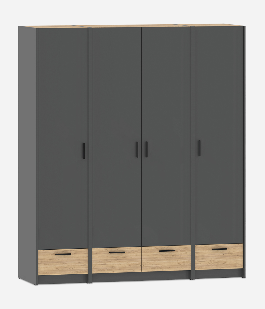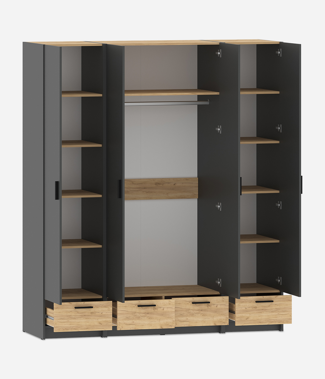 Четырехстворчатый шкаф со штангой, полками и четырьмя ящиками из новой коллекции Оттавия представлен в двух цветах на выбор – белый и антрацит. Шкаф отлично подойдет в гостиную для любого современного интерьера, как скандинавского, так и урбанистического.