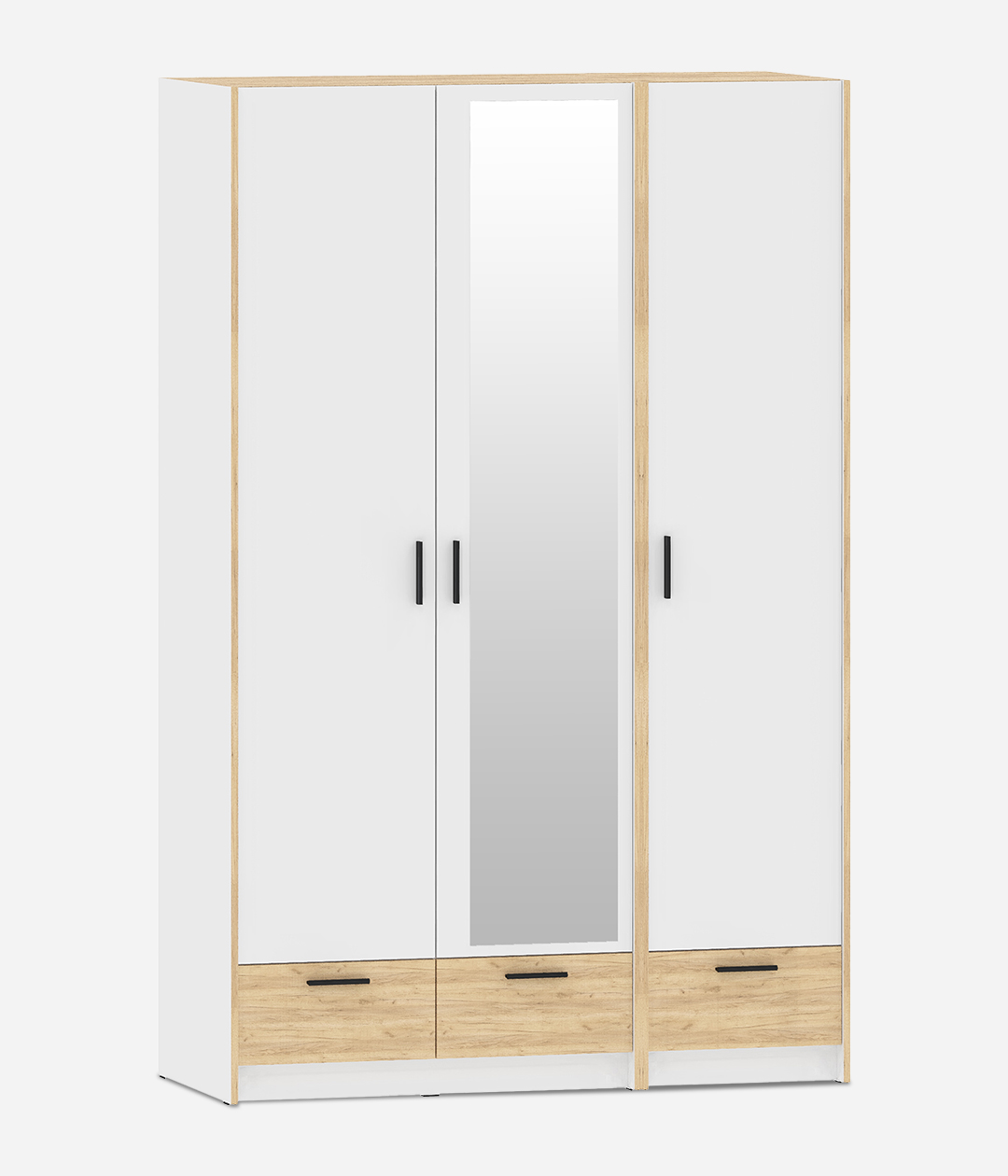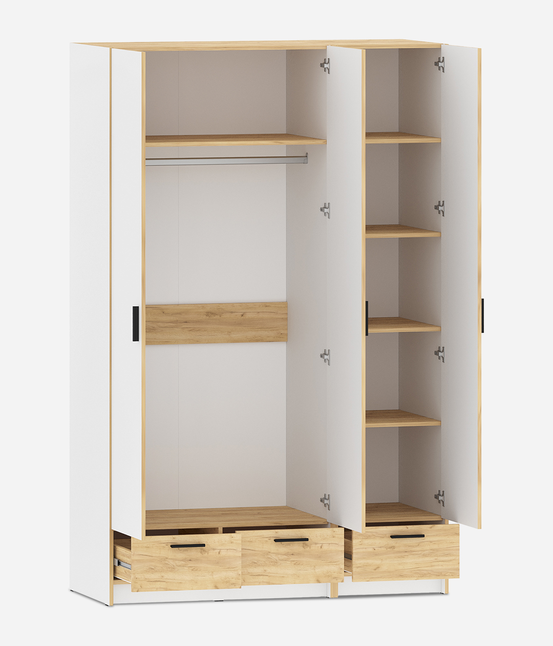 Трехстворчатый шкаф со штангой, полками и тремя ящиками новой коллекции Оттавия представлен в двух цветах на выбор – белый и антрацит. Шкаф отлично подойдет в гостиную для любого современного интерьера, как скандинавского, так и урбанистического.