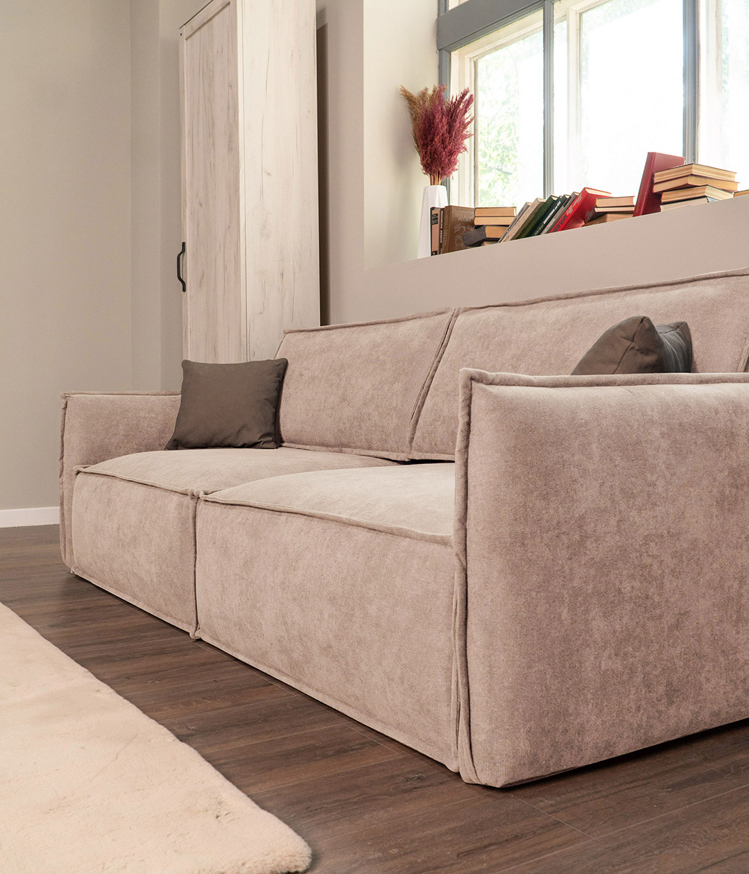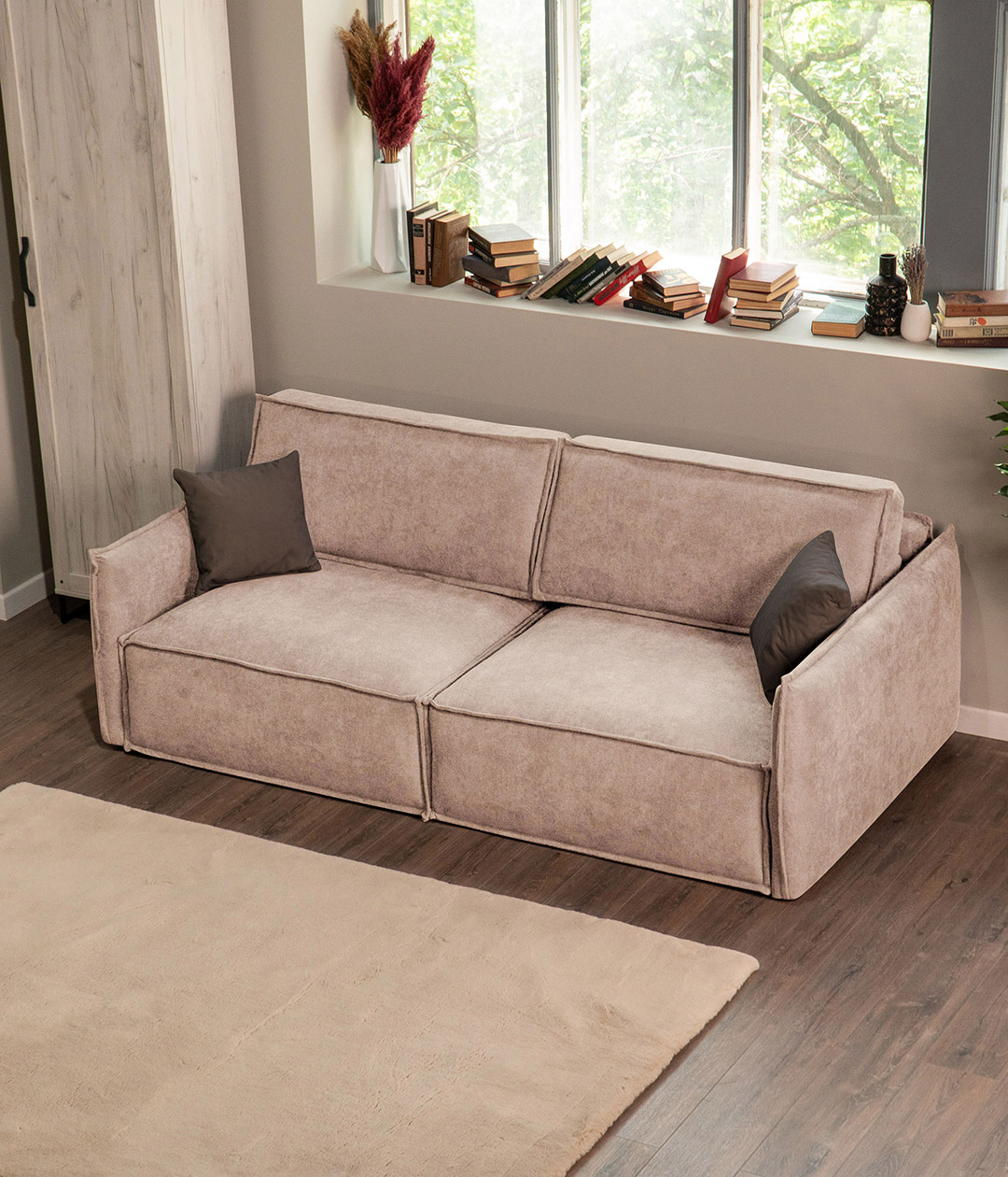 Глубокая, комфортная посадка при малых габаритах. А узкие подлокотники придают дивану утонченный, стильный вид и берегут пространство.