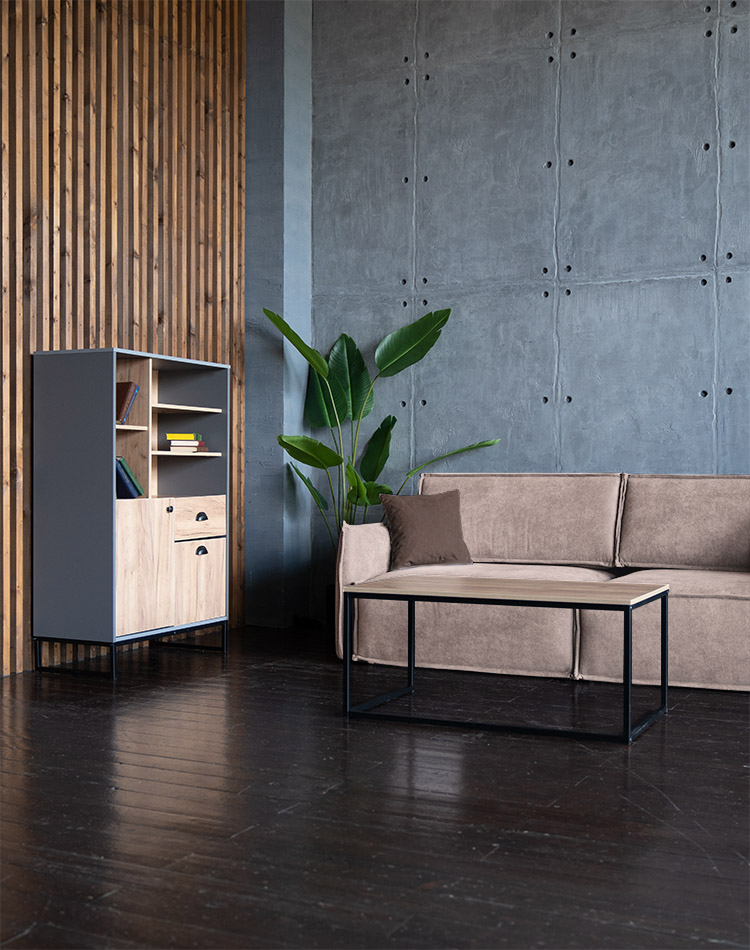 Диван Пеория Бежевый, Высокий шкаф Лофт и Журнальный стол Лофт