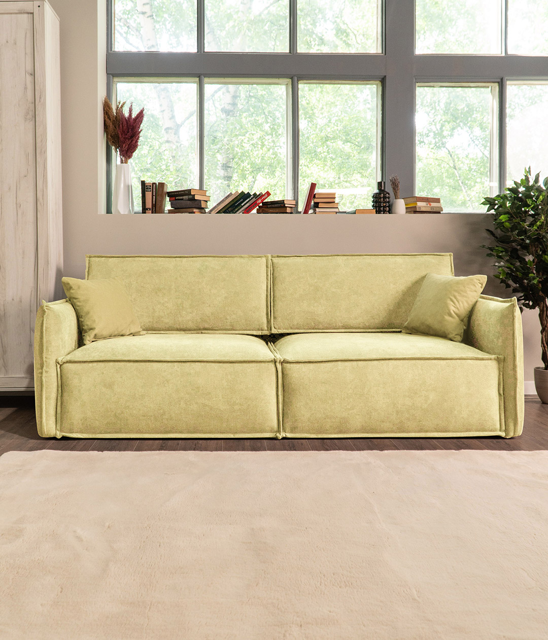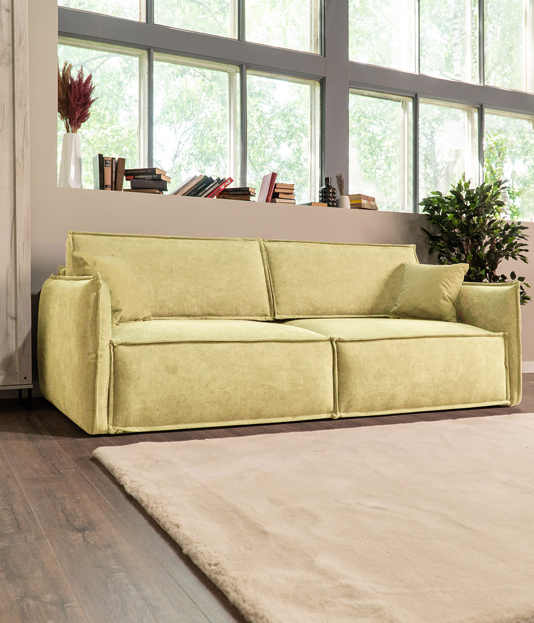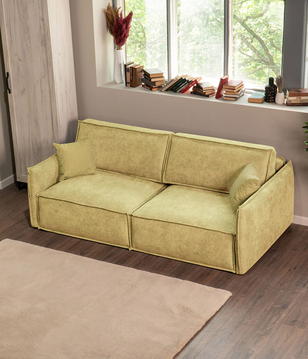Глубокая, комфортная посадка при малых габаритах. А узкие подлокотники придают дивану утонченный, стильный вид и берегут пространство.