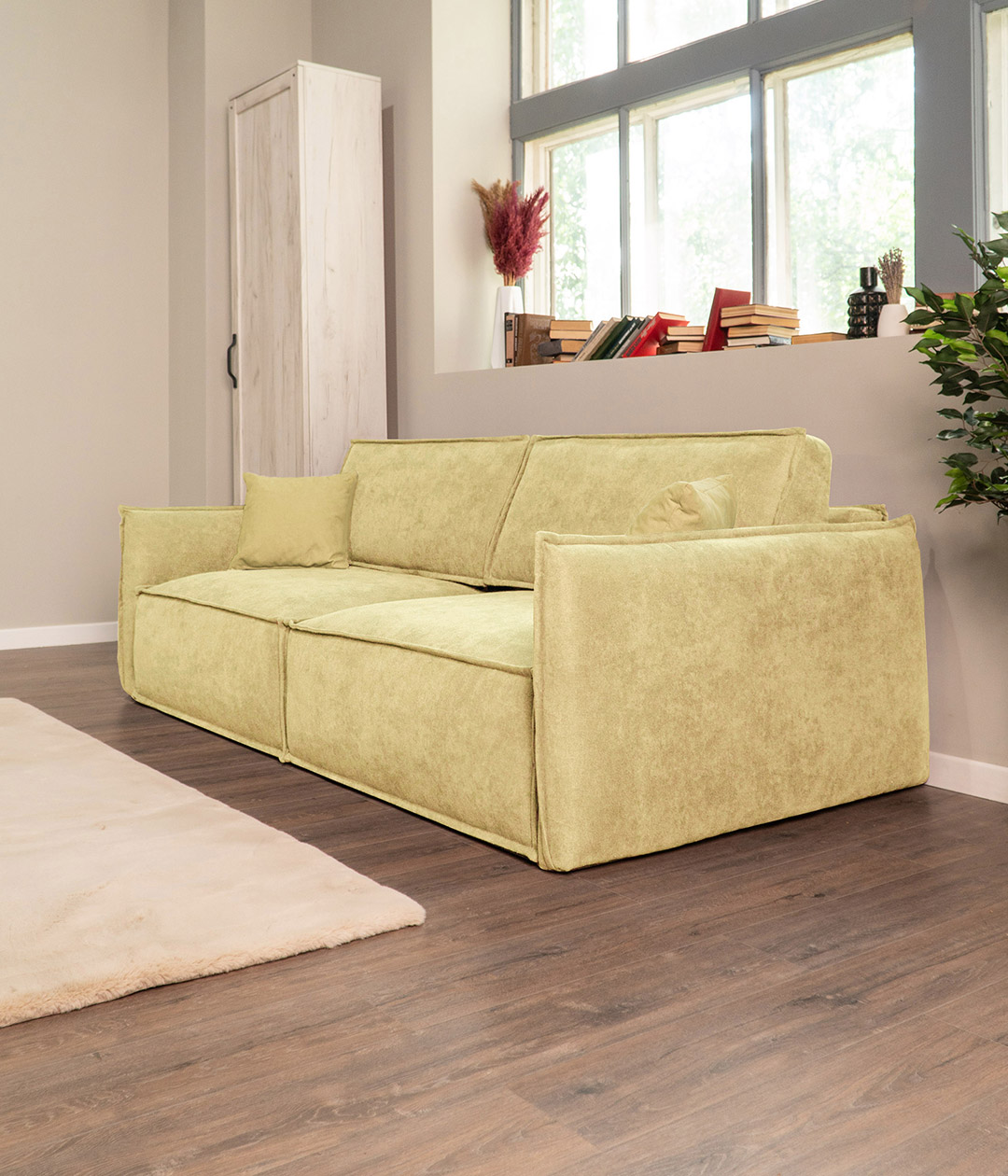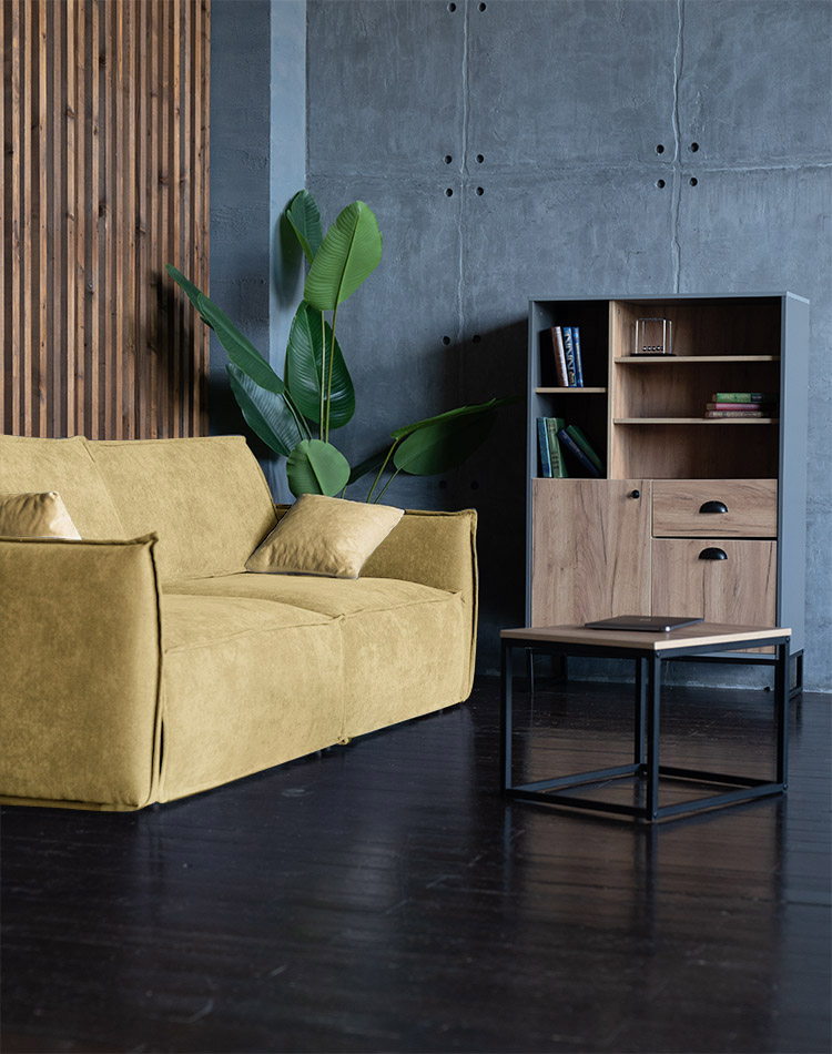 Диван Пеория Лимонный, Высокий шкаф Лофт и Журнальный стол Лофт