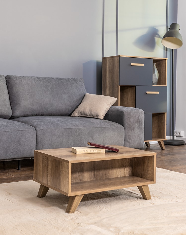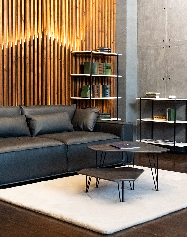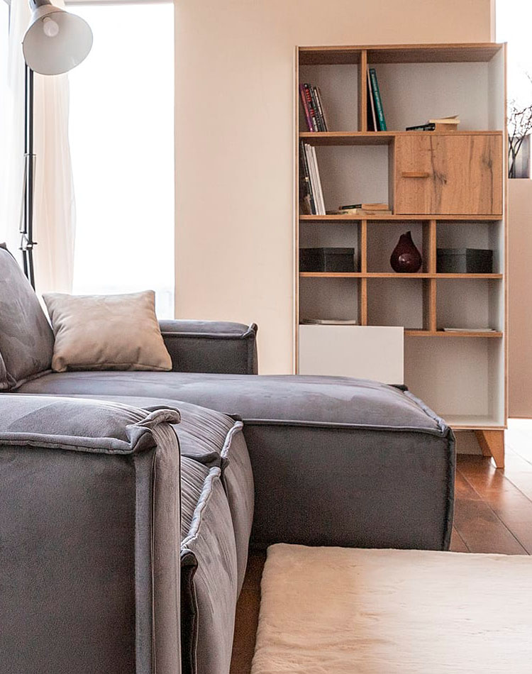 Диван Лестер, комплект столиков Тет-а-тет и стеллаж Атлантик