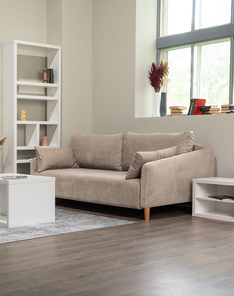 Диван Гримсби Бежевый и гостиная Ридл: стол, стеллаж, тумба