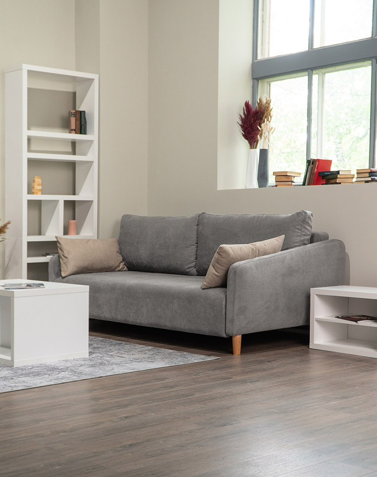 Диван Гримсби Серый и гостиная Ридл: стол, стеллаж, тумба