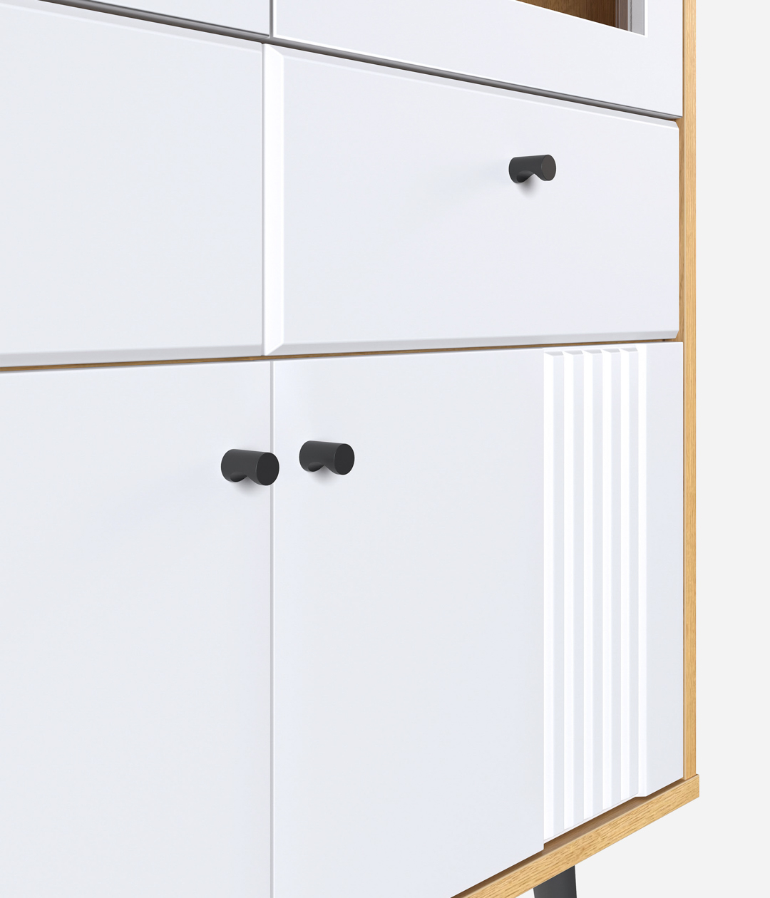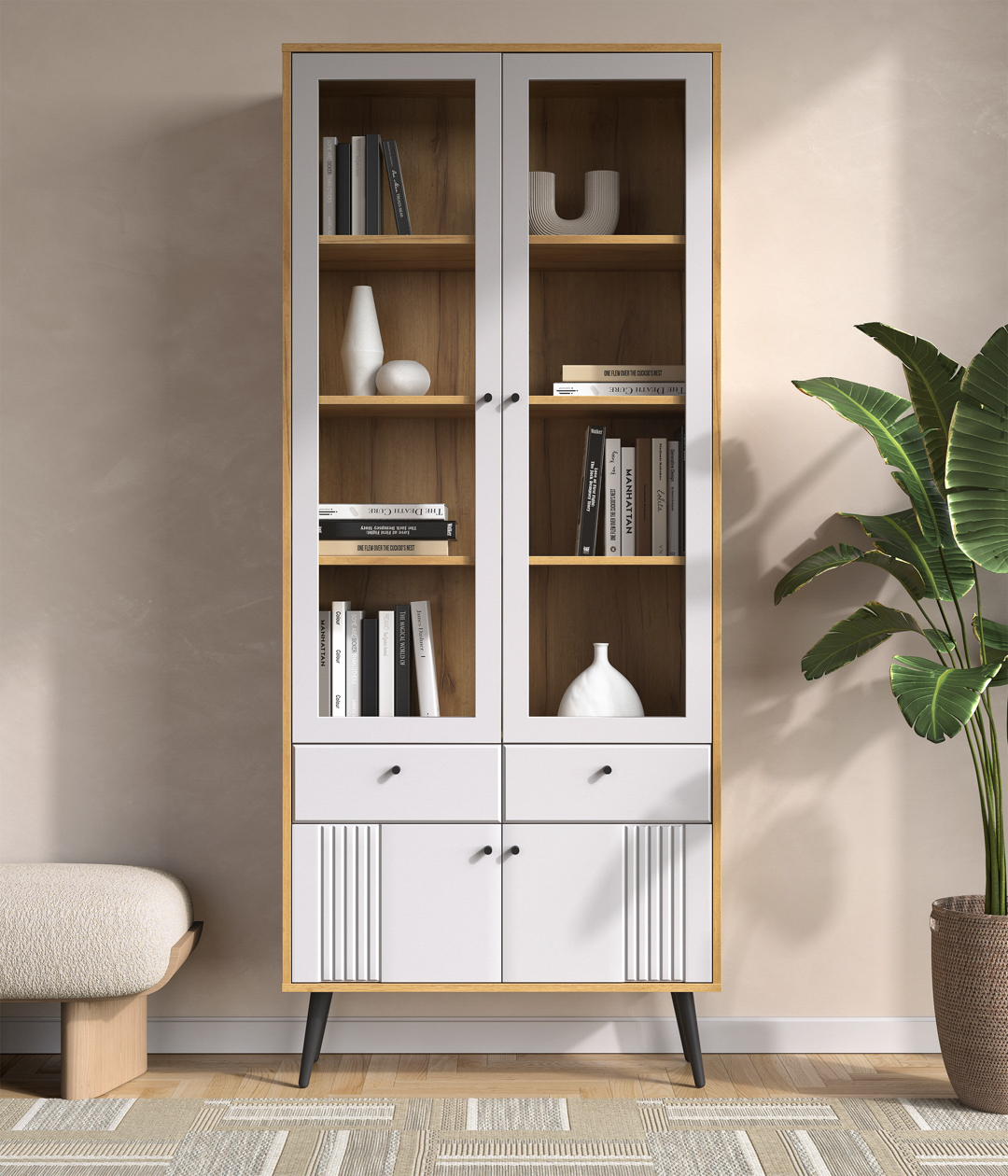 В дизайне витрины Саксония нет ничего лишнего. Такая мебель привлекает внимание своей лаконичностью, позволяющей легко вписать модель в любые современные интерьеры. Особенность шкафа — наличие как закрытых, так и открытых полок.