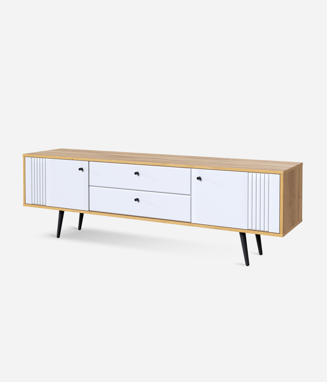 ТВ-тумба «Саксония» выполнена в спокойных тонах в сочетании с элементами из дерева, миниатюрными ручками и ножками. Оригинальный дизайн, в котором отсутствуют стандартные и скучные решения, придаст интерьеру гостиной уютный вид, где тумба с установленным на неё телевизором станет центром мебельной композиции.