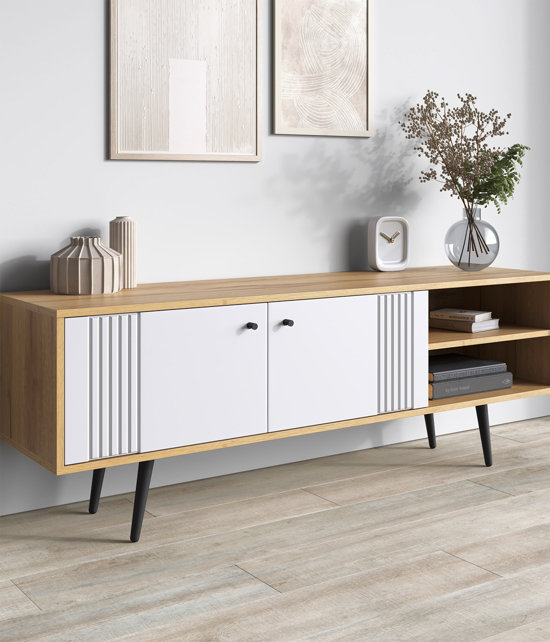 Тумба «Саксония» выполнена в спокойных тонах в сочетании с элементами из дерева, миниатюрными ручками и ножками. Оригинальный дизайн, в котором отсутствуют стандартные и скучные решения, придаст интерьеру гостиной уютный вид, где тумба с установленным на неё телевизором станет центром мебельной композиции.