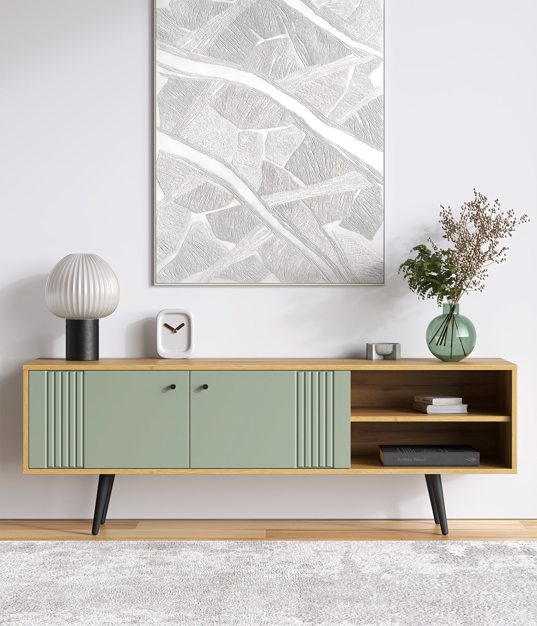 Тумба «Саксония» выполнена в спокойных тонах в сочетании с элементами из дерева, миниатюрными ручками и ножками. Оригинальный дизайн, в котором отсутствуют стандартные и скучные решения, придаст интерьеру гостиной уютный вид, где тумба с установленным на неё телевизором станет центром мебельной композиции.