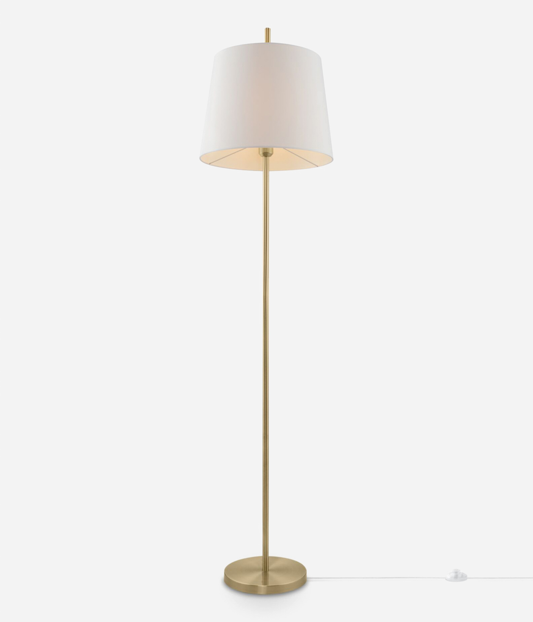В торшере нет ничего лишнего: максимально лаконичная металлическая арматура цвета античной латуни, минималистичный тканевый абажур. Его белый оттенок удачно освежает композицию, а сам абажур делает освещение уютным и мягким.