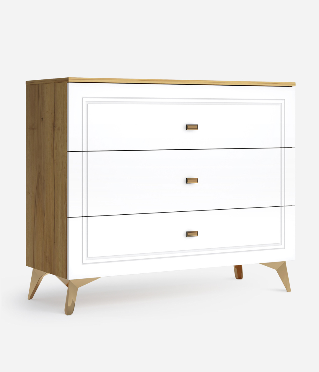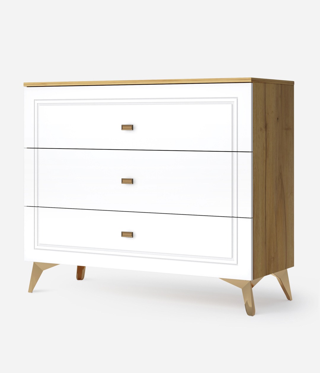 Комод Вега Сапфир оснащен тремя широкими ящиками, которые помогут поддерживать порядок в вещах. Высокие ножки служат эффектным акцентом модели и упрощают уборку. Тонкие линии фрезеровки и миниатюрные ручки в золотом декоре создают элегантный облик.