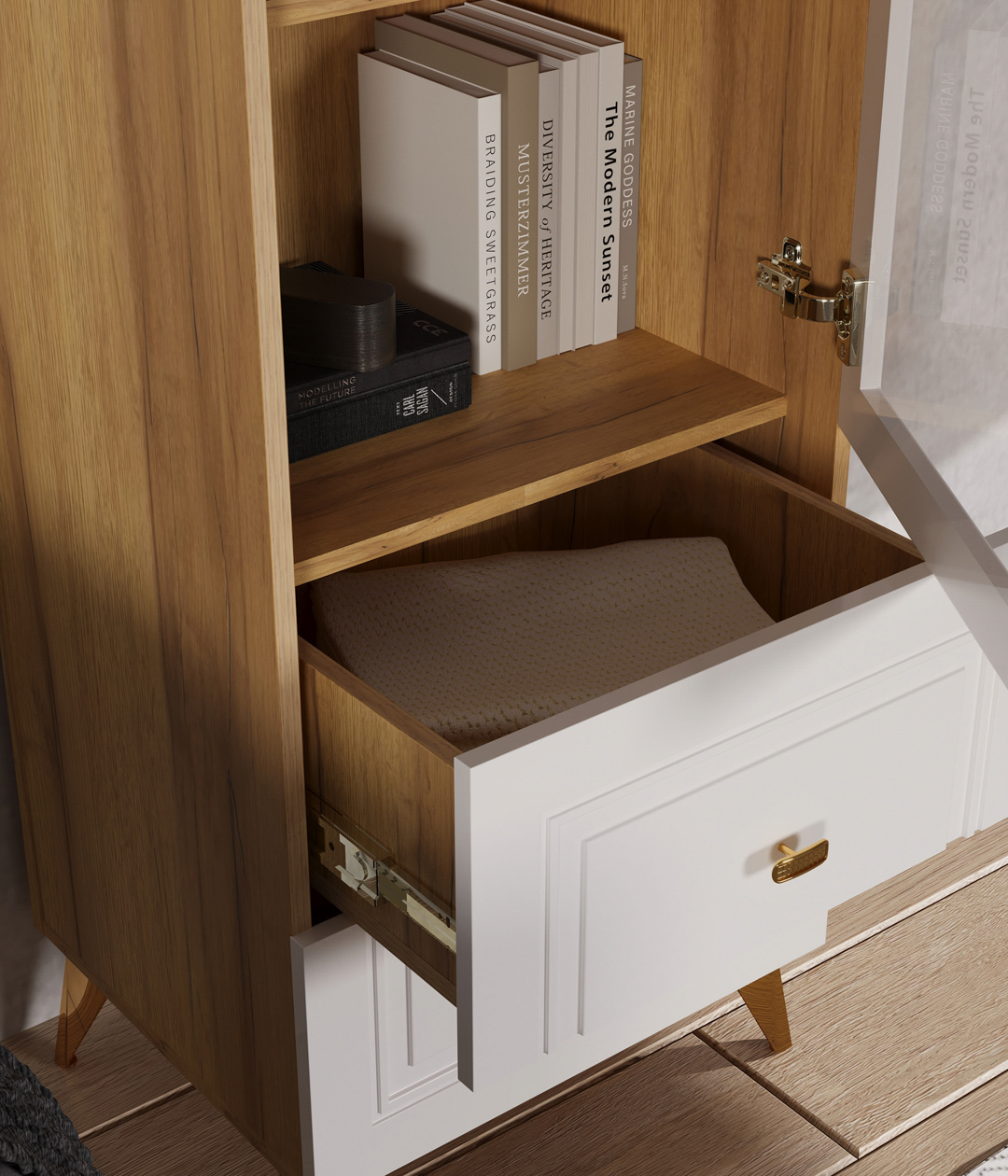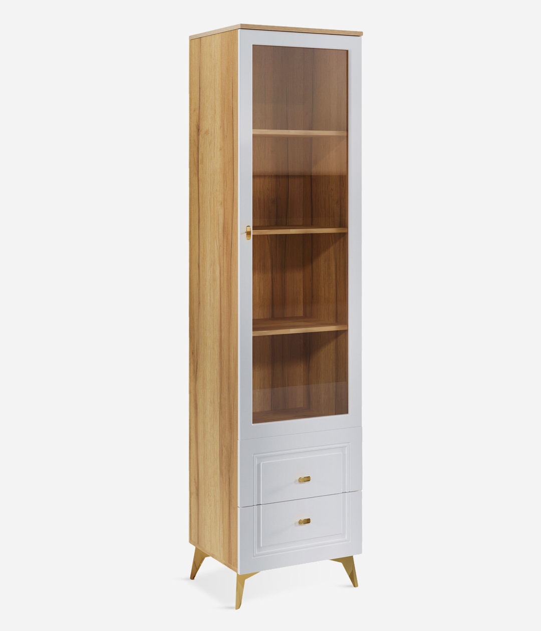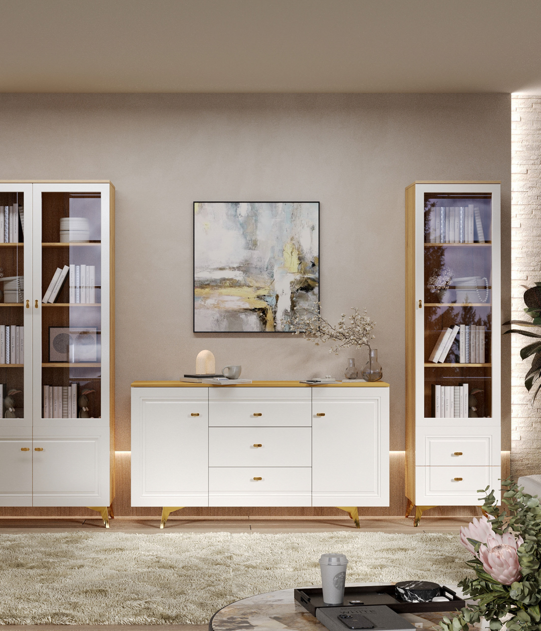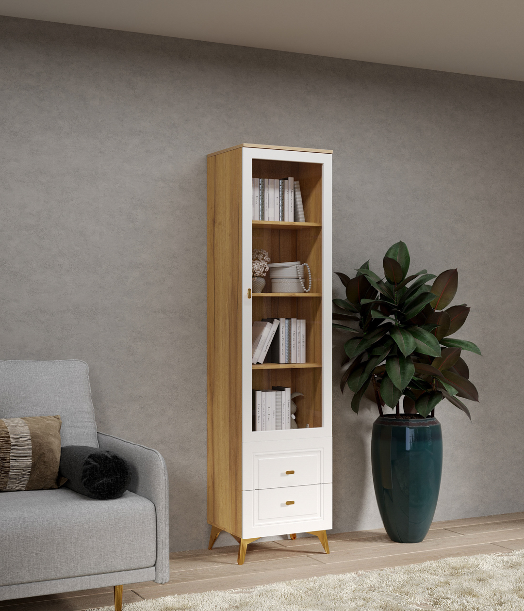 Шкаф-витрина Вега Сапфир станет украшением современной гостиной. Модель представляет идеальный баланс эстетики и комфорта. Фасады с элегантной фрезеровкой дополнены изящными акцентными ручками, что придает интерьеру более статусный вид.