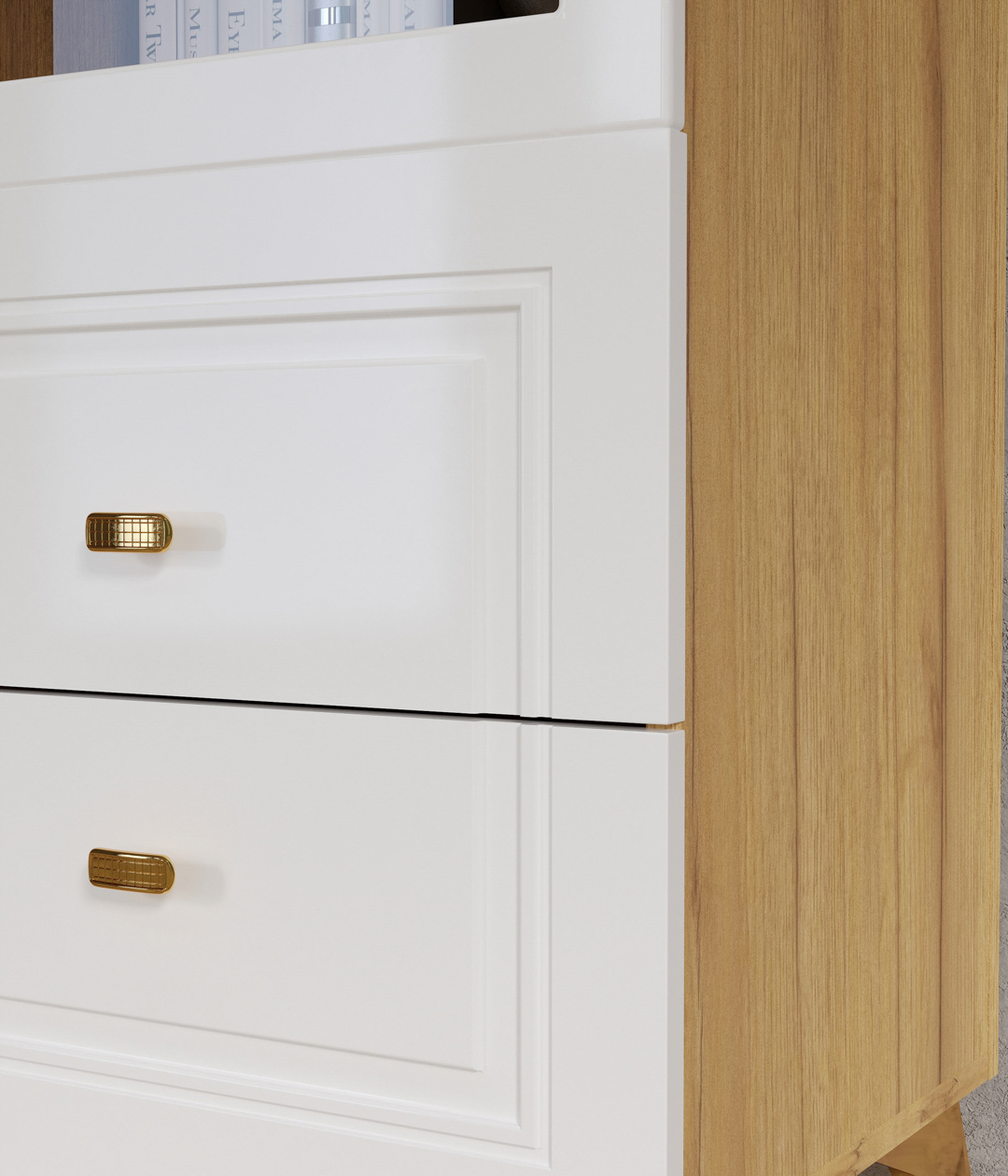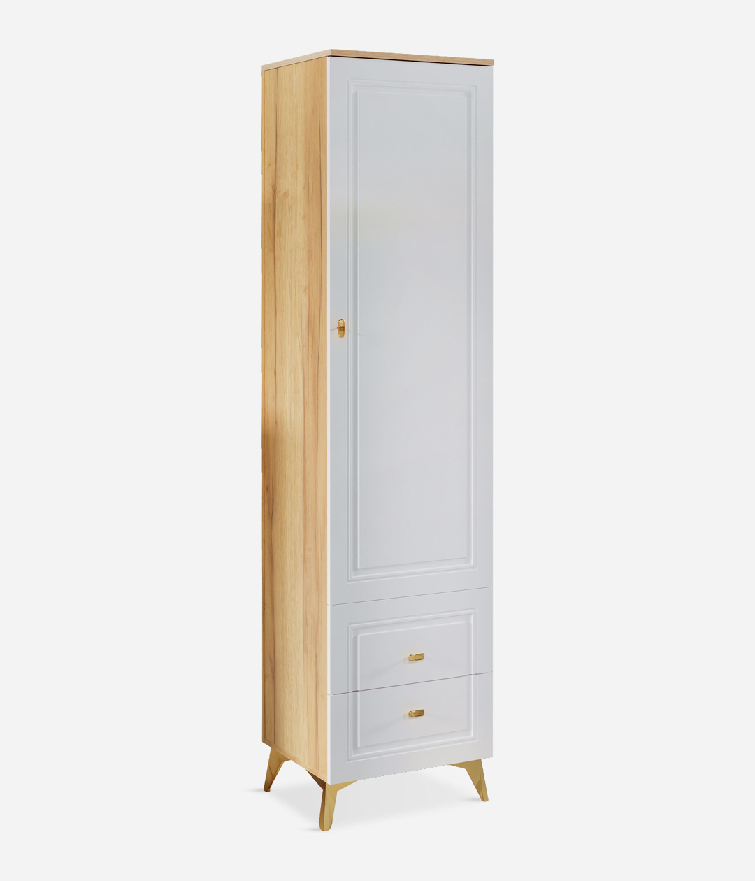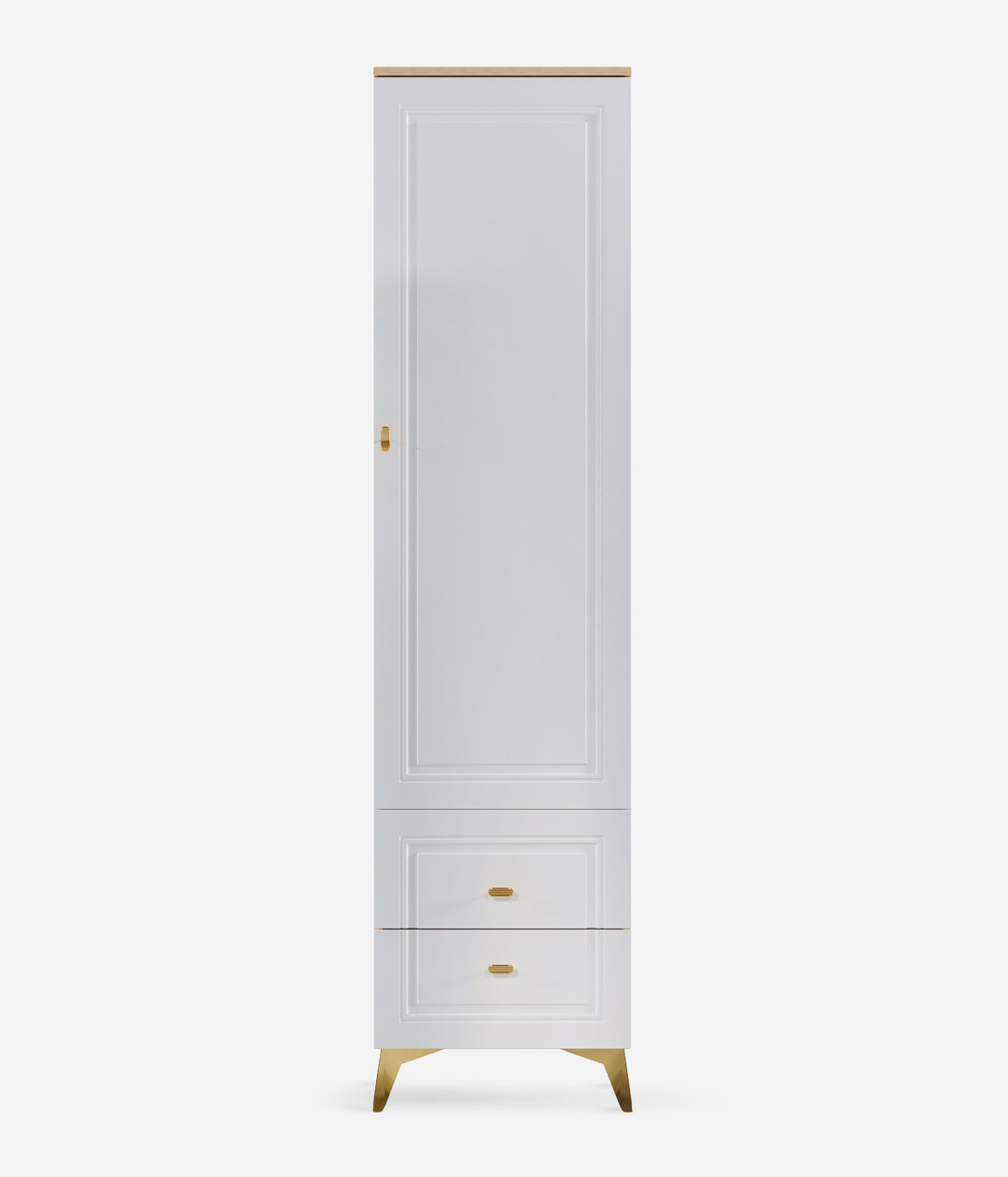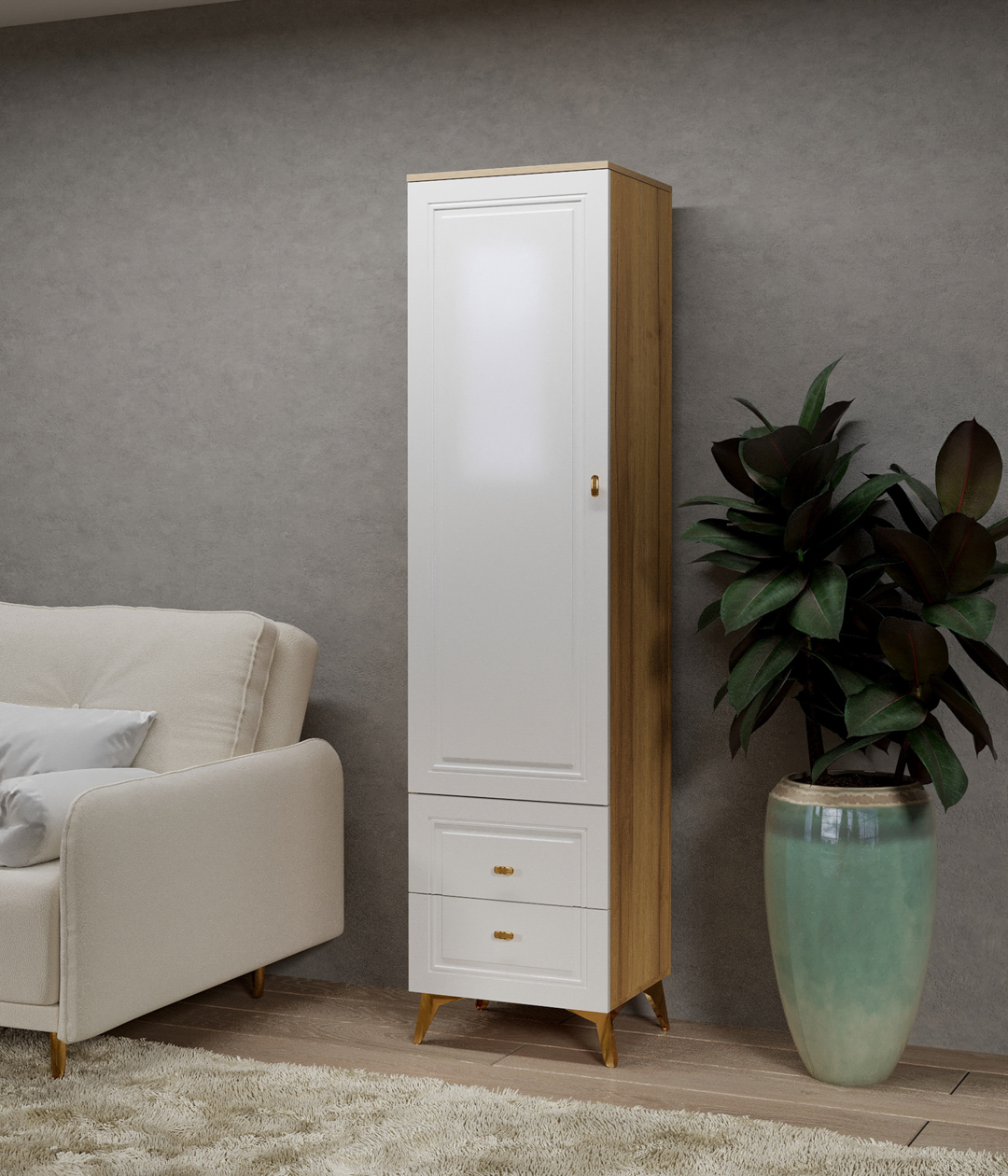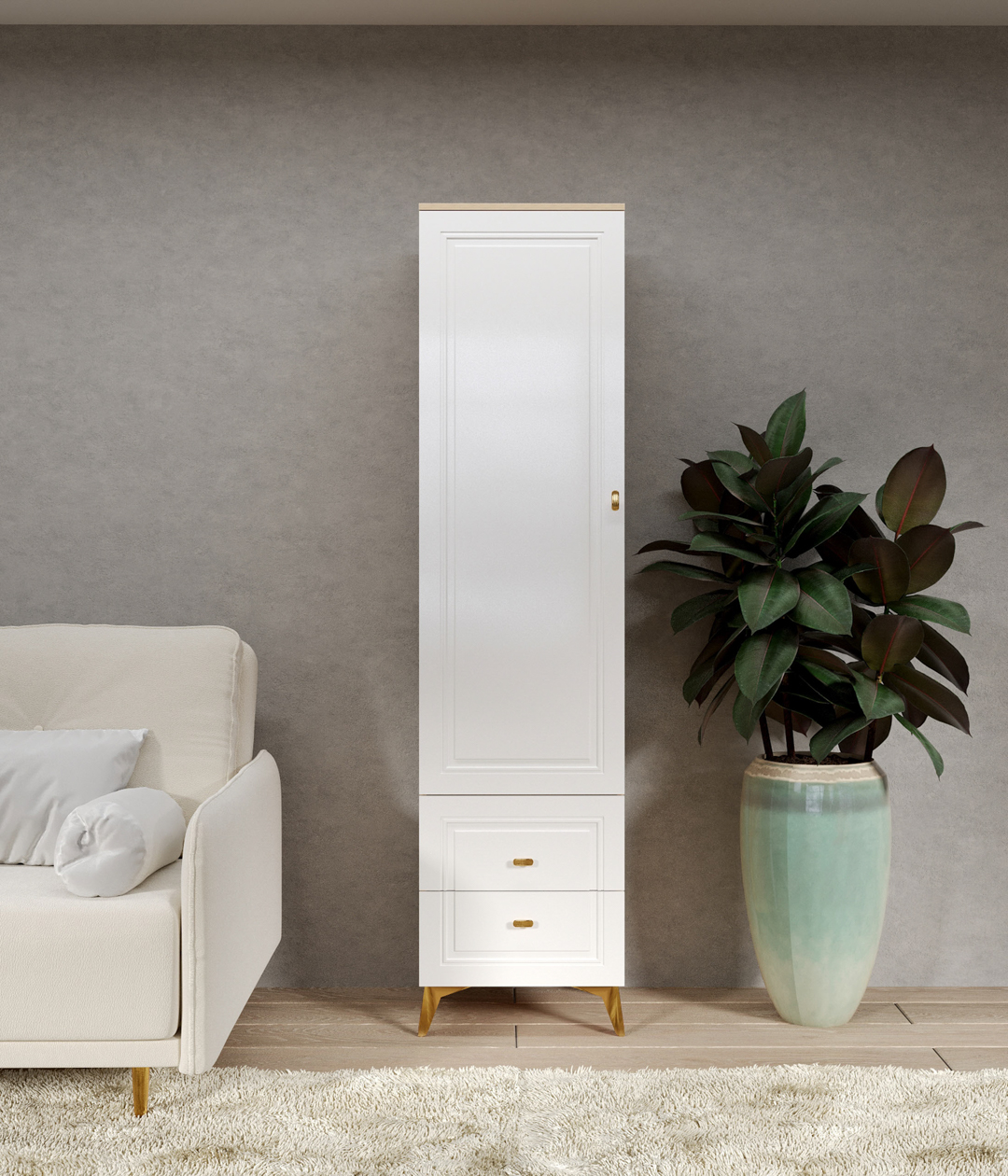 Распашной шкаф Вега Сапфир — изящное решение для интерьера гостиной. Узкая конструкция со строгими рамочными фасадами добавит эстетики и функционала даже небольшой комнате. Комплект полок и выдвижные ящики обеспечат место для предметов гардероба, аксессуаров и украшений.