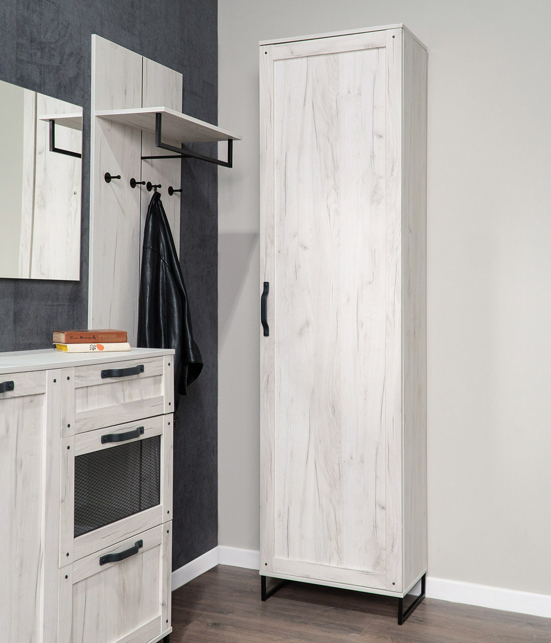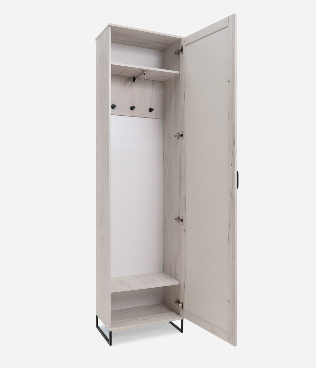 Распашной шкаф Сидней — модель, в которой удачно сочетаются стильное исполнение и практичный дизайн. Внутри есть ниша с евро-штангой для верхней одежды и пара полок для хранения коробок с обувью, сумок или сезонных аксессуаров.