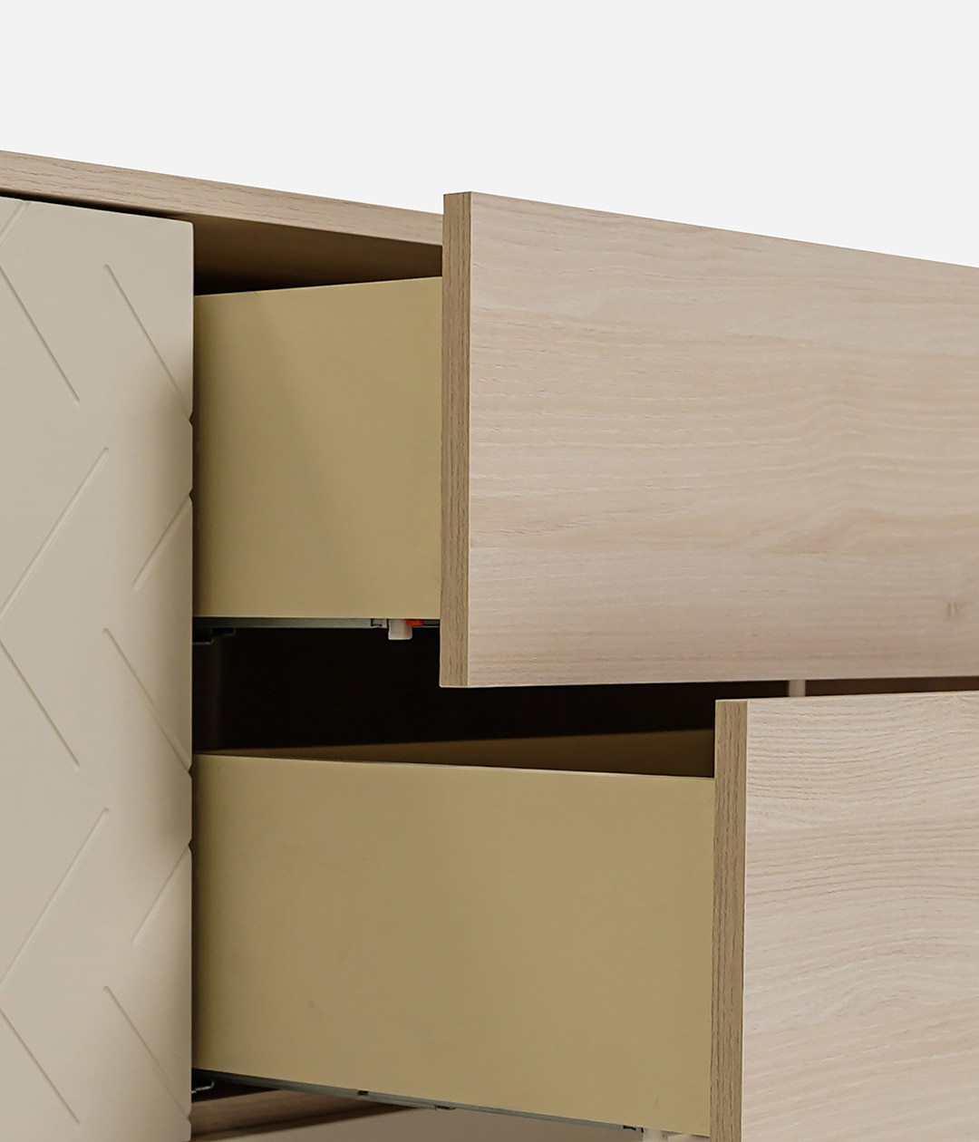 Модель оснащена двумя выдвижными ящиками с плавным ходом и полками за закрытыми дверцами, что позволяет держать под рукой необходимые вещи.