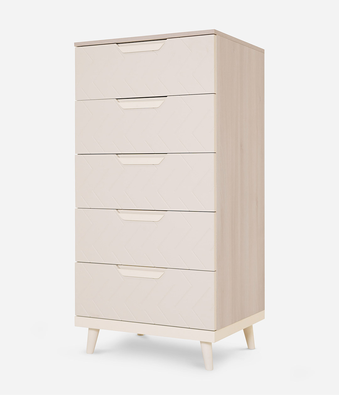 Функциональный и вместительный комод для хранения вещей и одежды состоит из 5 выдвижных ящиков. Его можно использовать как самостоятельно, так и в комплекте с корпусной мебели коллекции Сканди. Компактные размеры позволят разместить комод в любое помещение, а стильный вид гармонично смотреться в современном интерьере.
