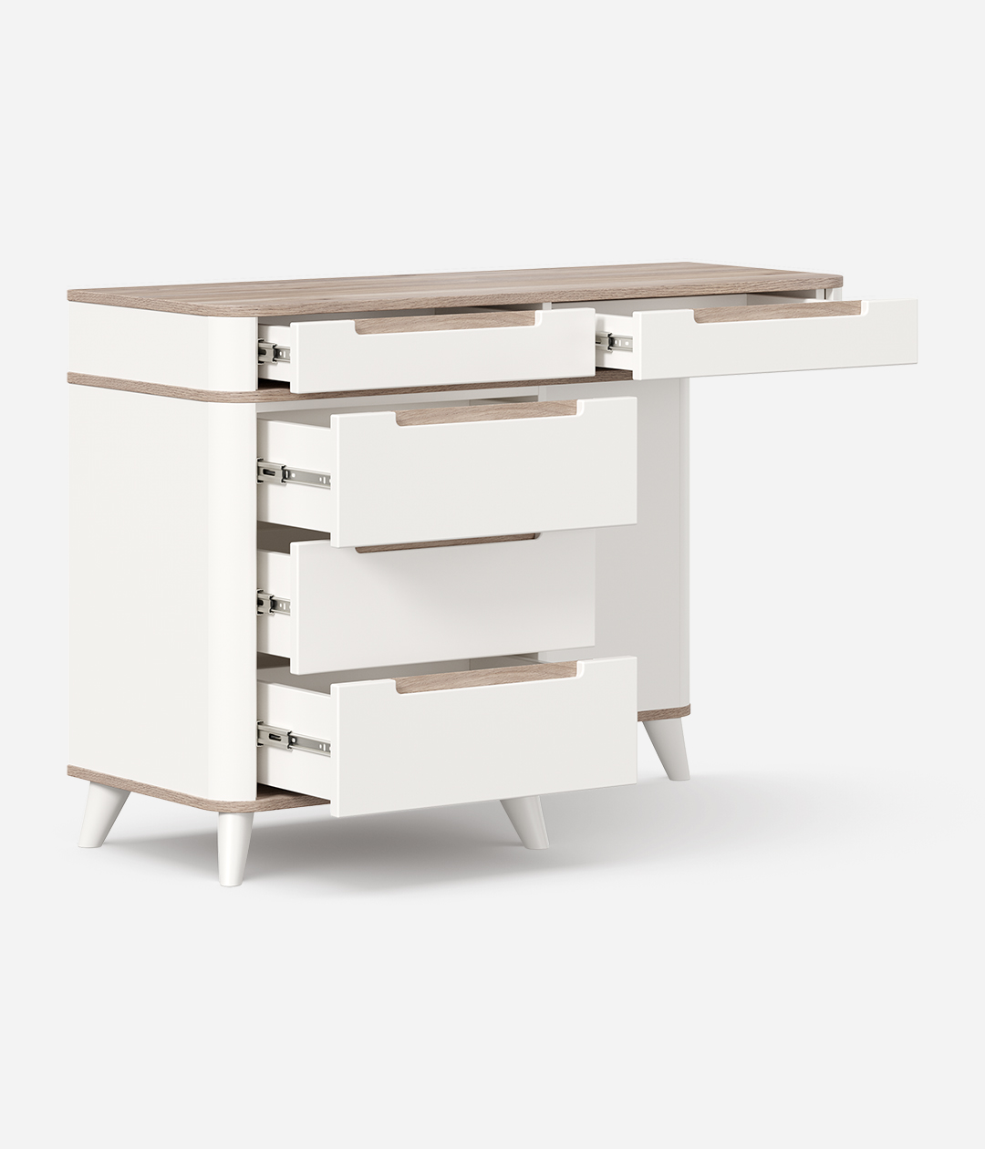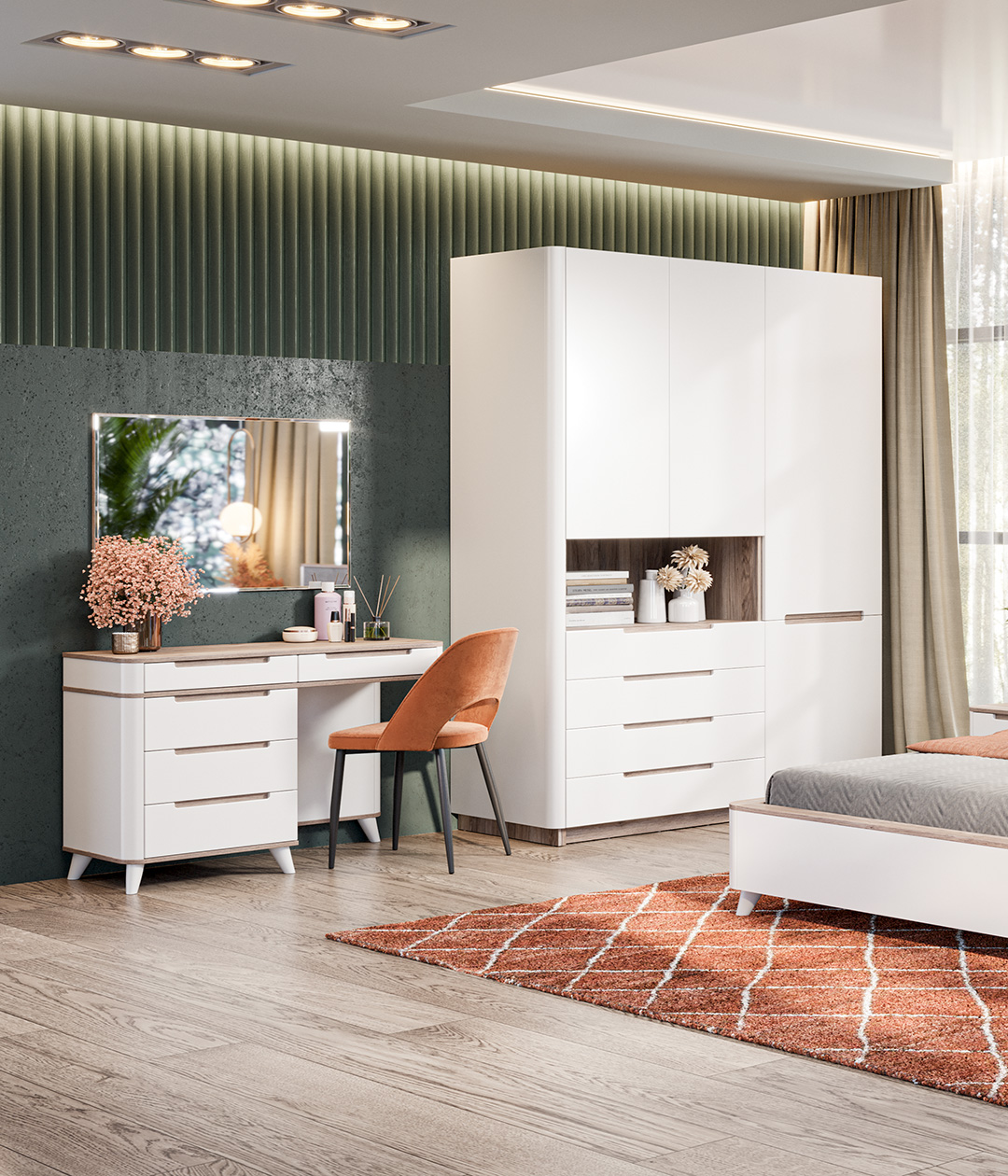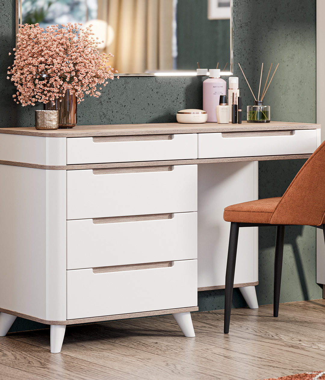 В числе достоинств туалетного стола Стефания: мягкость форм, нейтральное цветовое решение, компактность – и одновременно вместительность.