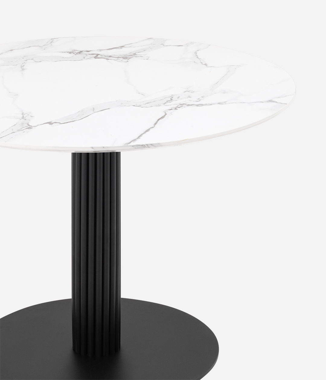 Обеденный стол «Stem D90» идеально подойдет для гостиной в современном стиле. Простая круглая форма стола позволит легко вписать его в современный интерьер, стол украсит кухню, гостиную или современное кафе, ресторан. Опорное плиссированное основание стола в лаконичном дизайне надёжно удерживает всю конструкцию и дополняет изящный образ.