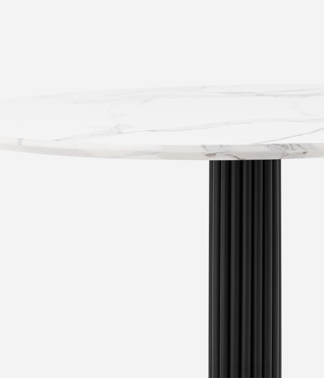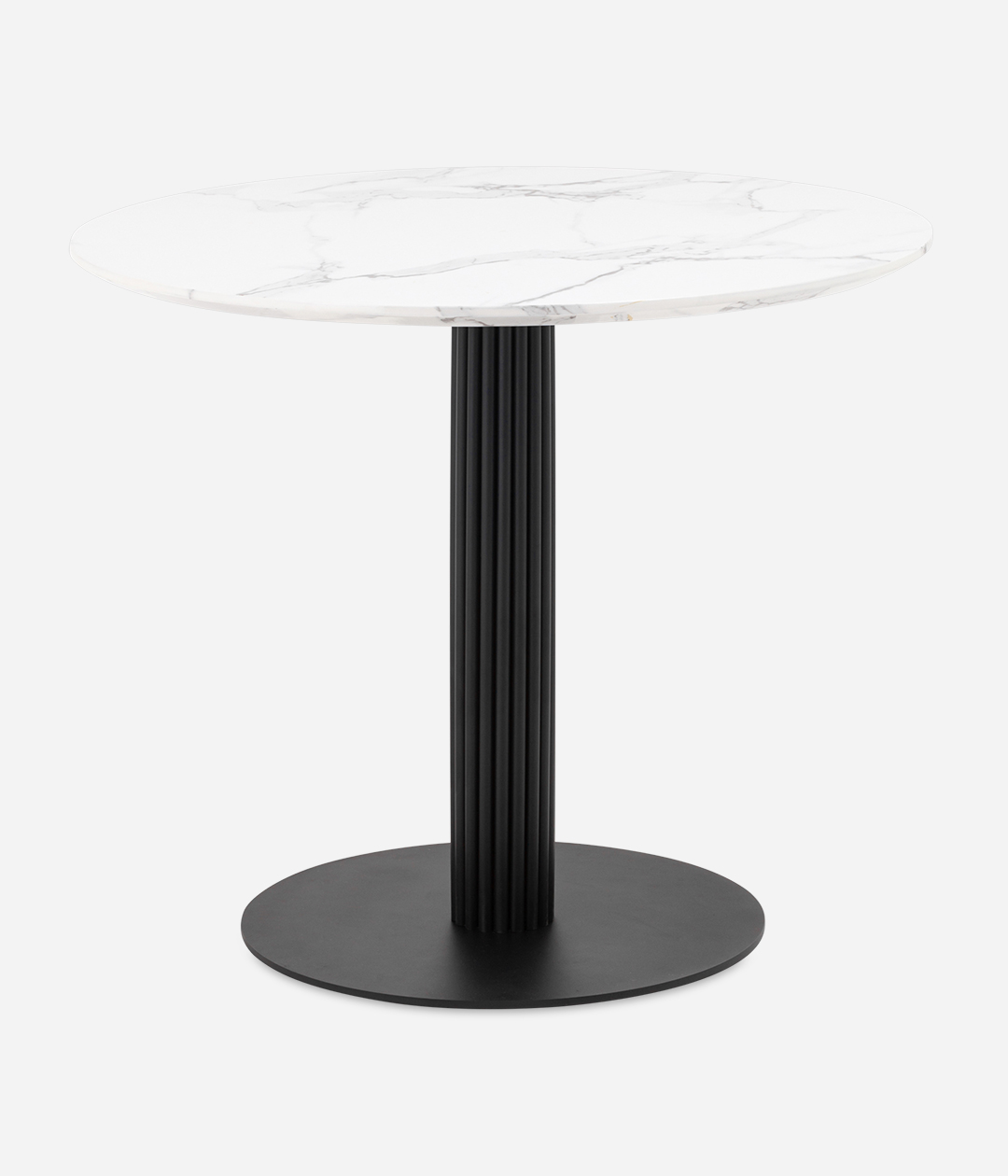 Поверхность столешницы декорирована рисунком белого мрамора, который идеально сочетается с металлическим основанием в черном цвете.
