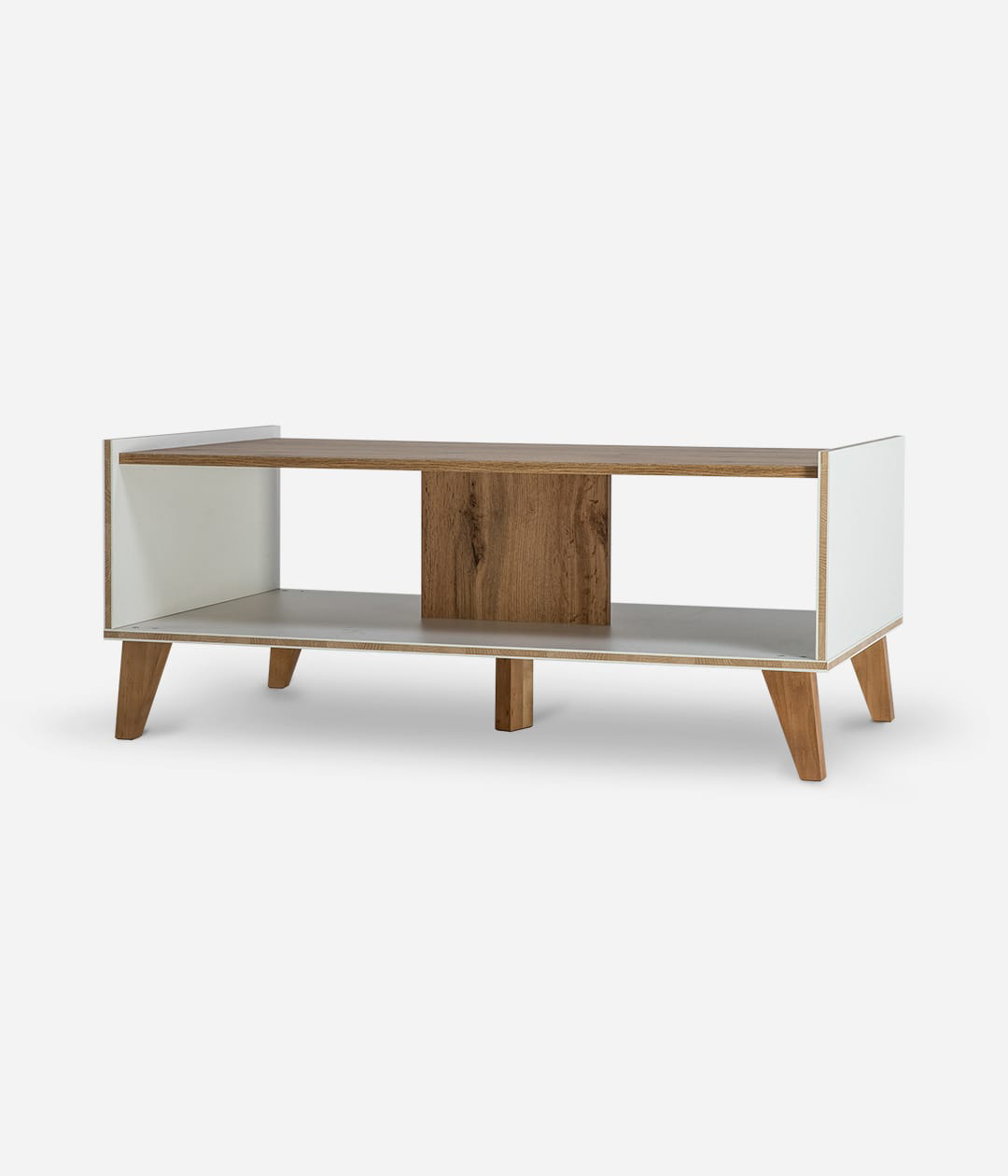 Функциональность и практичность — именно так можно охарактеризовать стол Сканди. Модель отличается компактными размерами — и будет хорошим решением для небольшой гостиной. Нотку винтажности модели придают расположенные под углом ножки древесного оттенка.