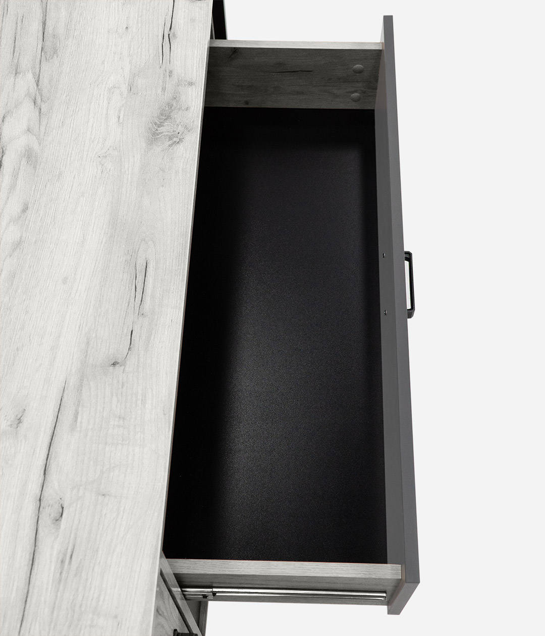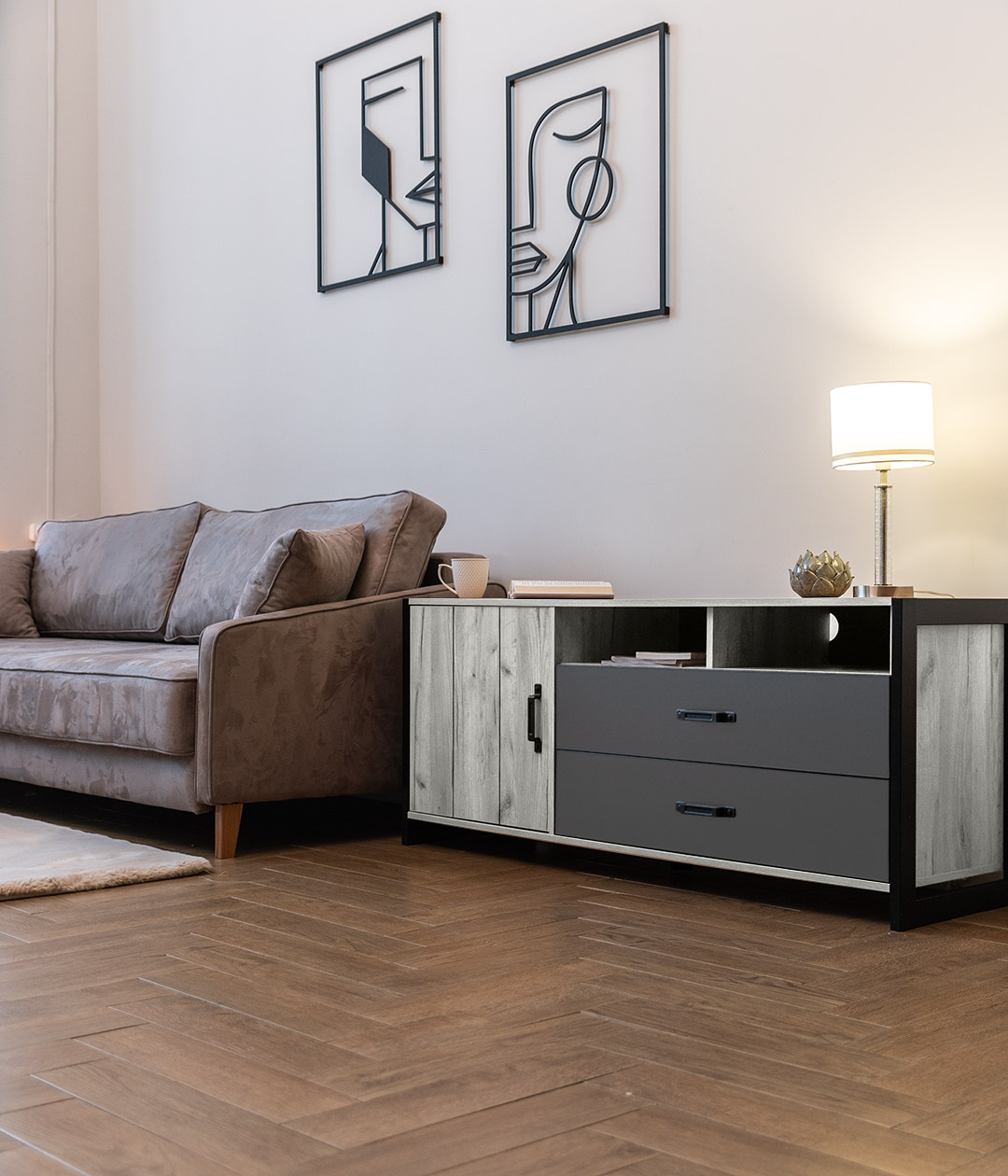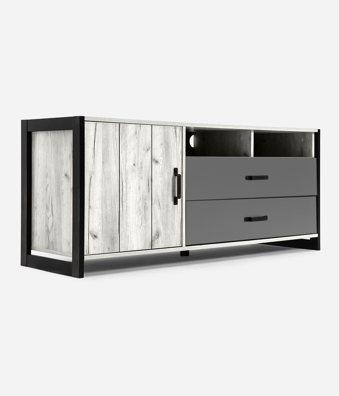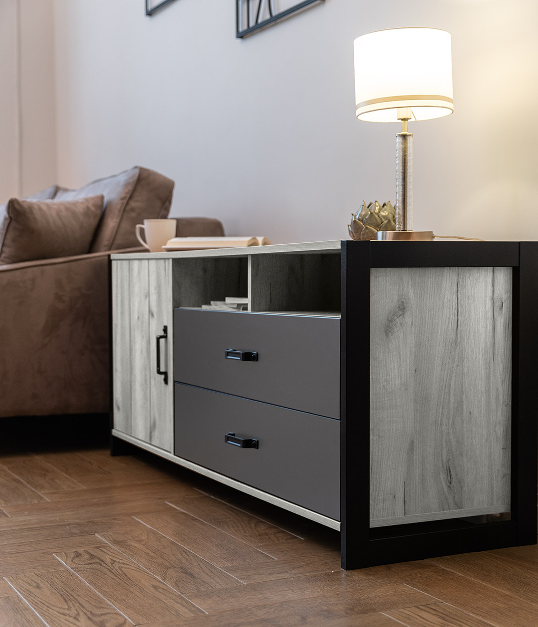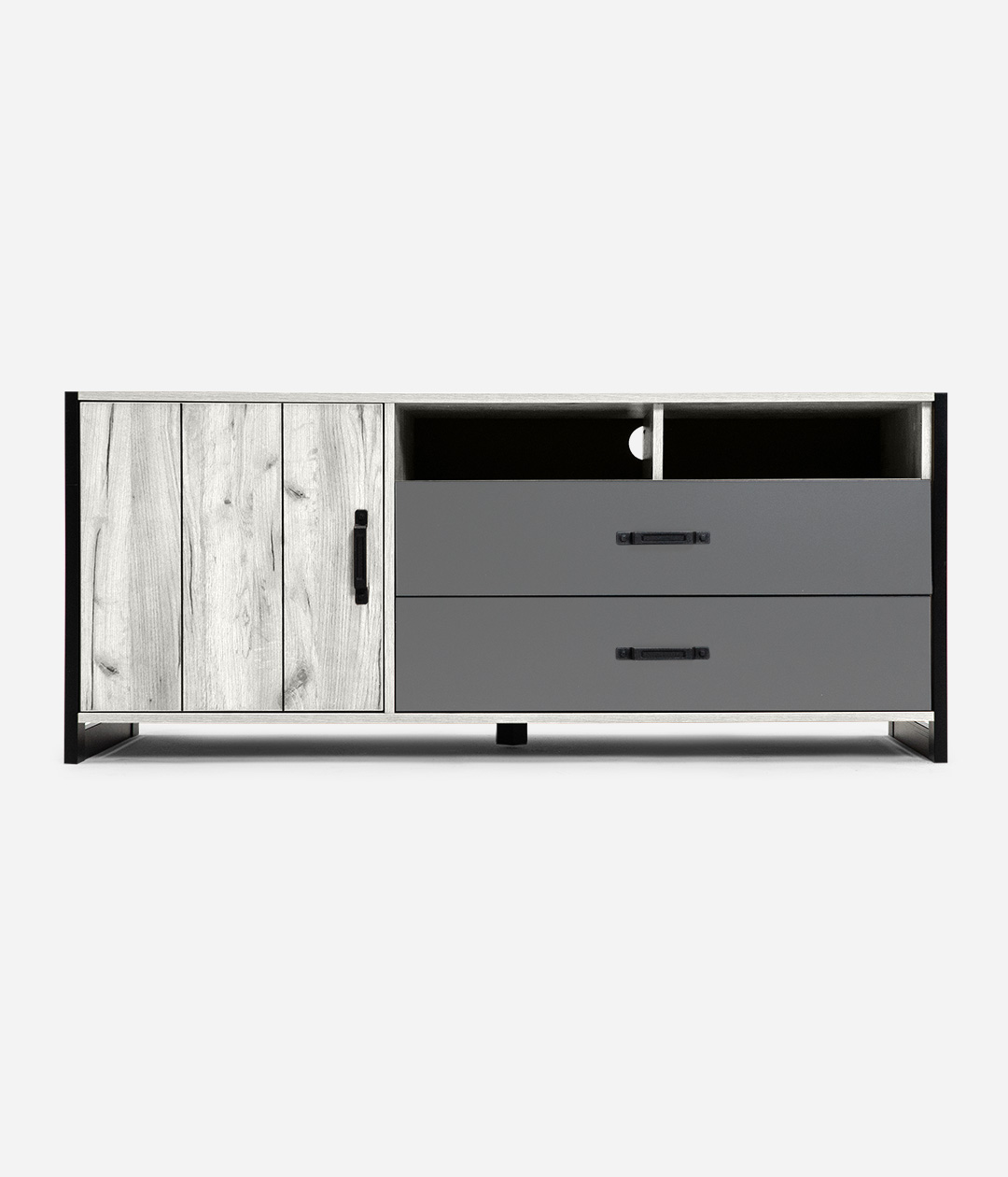 Функциональная и надежная ТВ-тумба Техно — это залог уютного и аккуратного интерьера. Комбинированное наполнение предусматривает отделения за распашной дверцей, а также ящики полного выдвижения. Высокие ножки не перегружают обстановку и позволяют удобно проводить уборку.