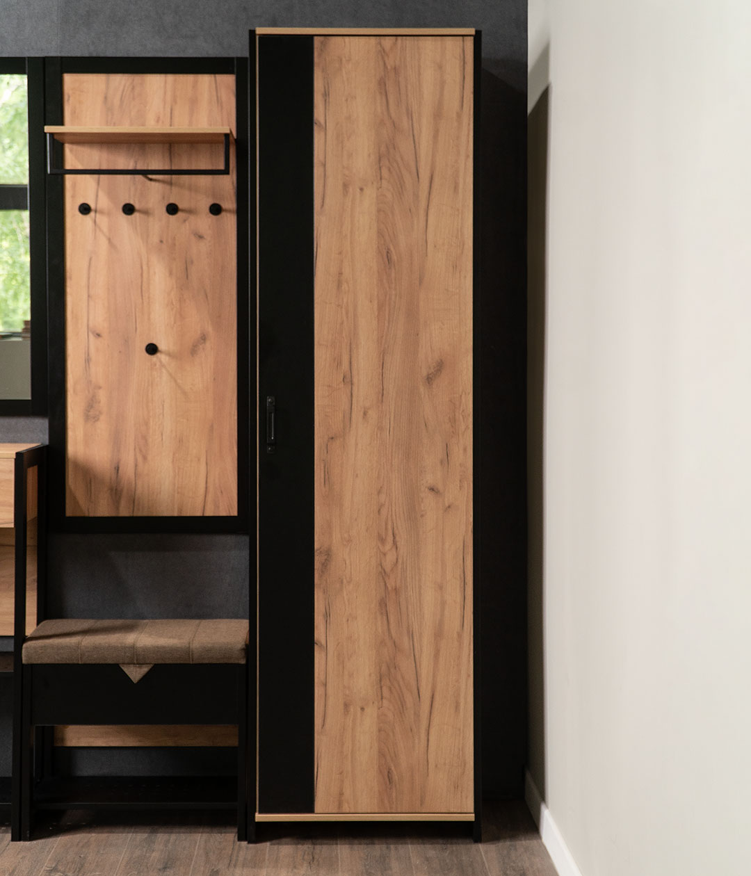 Распашной шкаф Техно — компактная модель для хранения гардероба, которая отлично подойдёт для установки в прихожую или комнату.