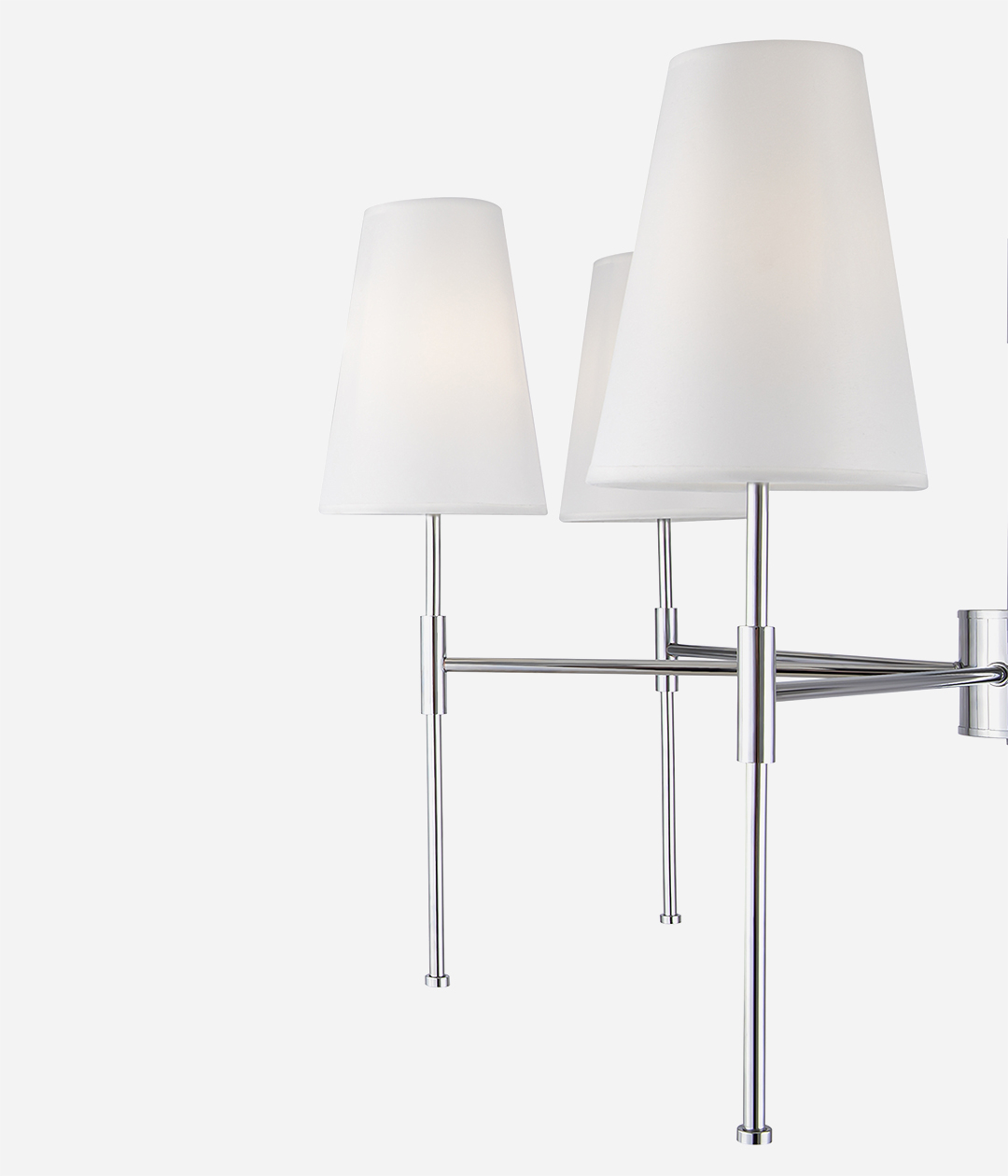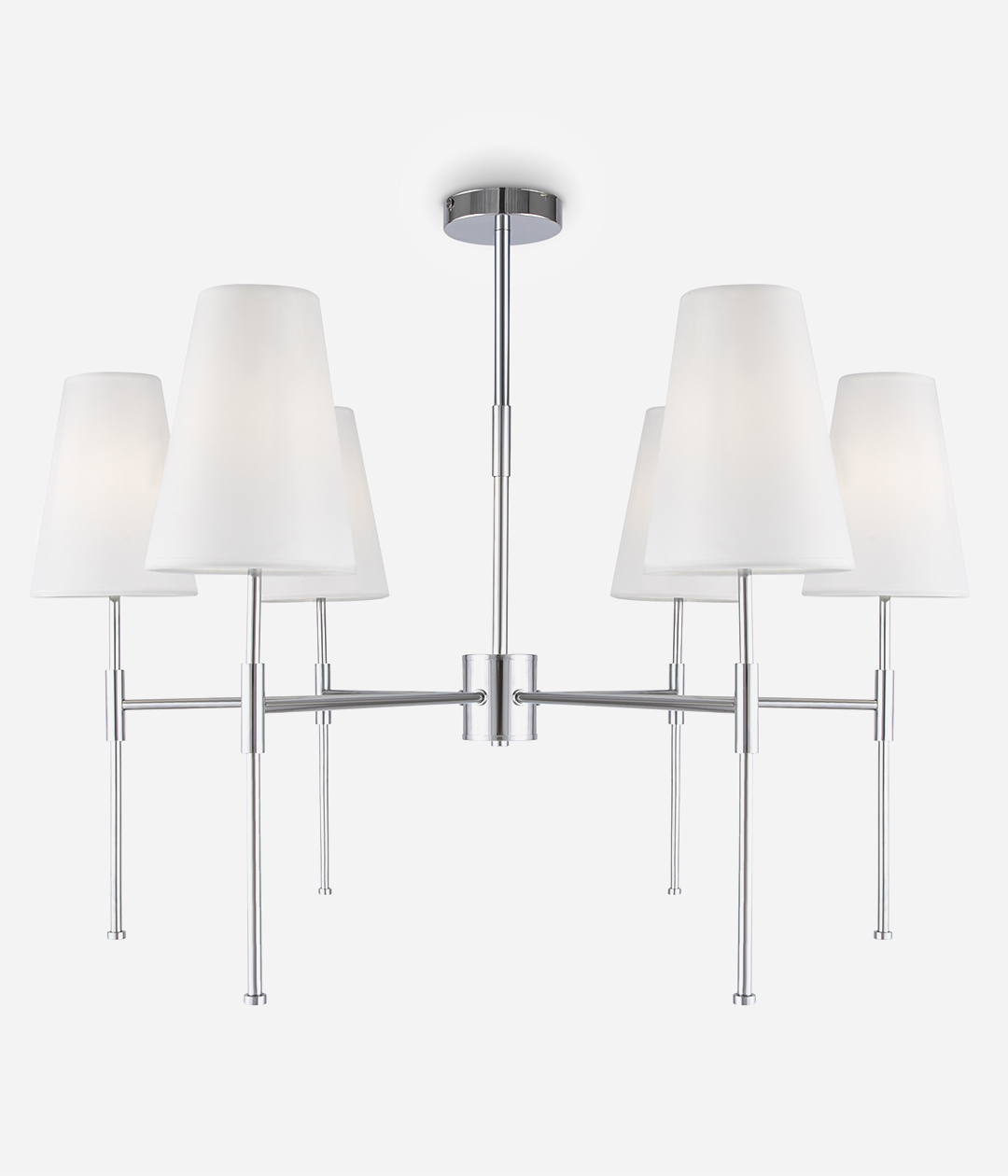 Каждая деталь люстры Tida имеет значение. Так, акцентный вытянутый силуэт вслед за собой «вытягивает» и всё освещаемое пространство. Арматура и удлиненные рожки изготовлены из металла и представлены в двух цветовых решениях: выигрышная комбинация черного и латуни, а также востребованный хром. Строгая симметрия элементов и геометрия в дизайне делают композицию визуально легкой и невесомой. Вытянутые абажуры выполнены из белой ткани.