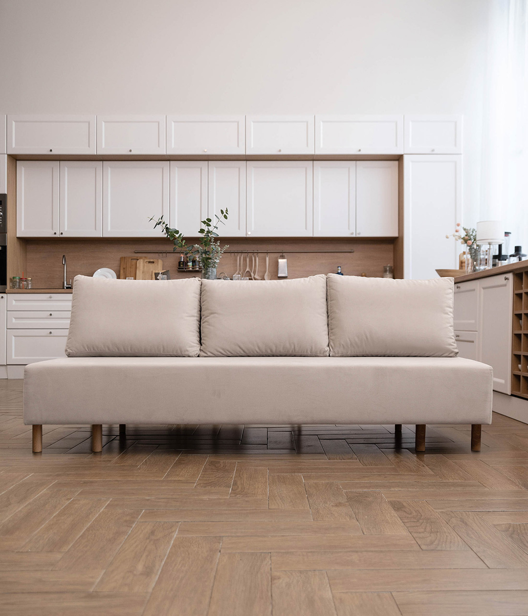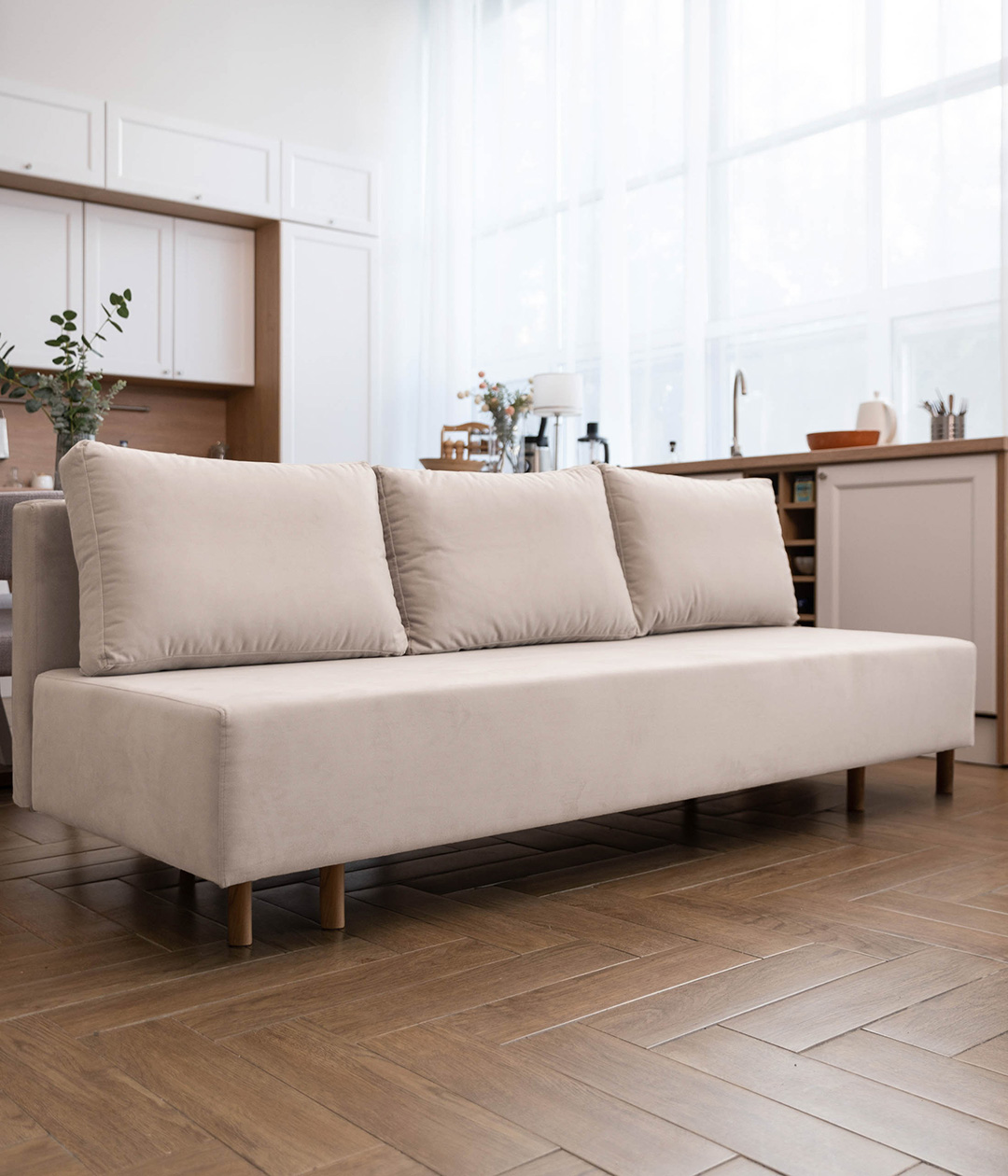 Диван Трентон в скандинавском стиле без подлокотников идеально подходит для тех, кто ценит минимализм и функциональность. Ровное спальное место обеспечивает комфортный отдых, а высокие ножки придают легкость и современный вид. Этот диван станет отличным решением для компактных помещений, сочетая удобство и стиль.